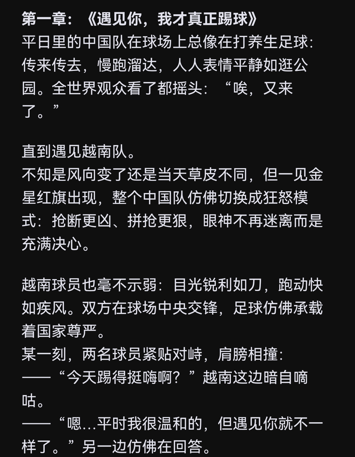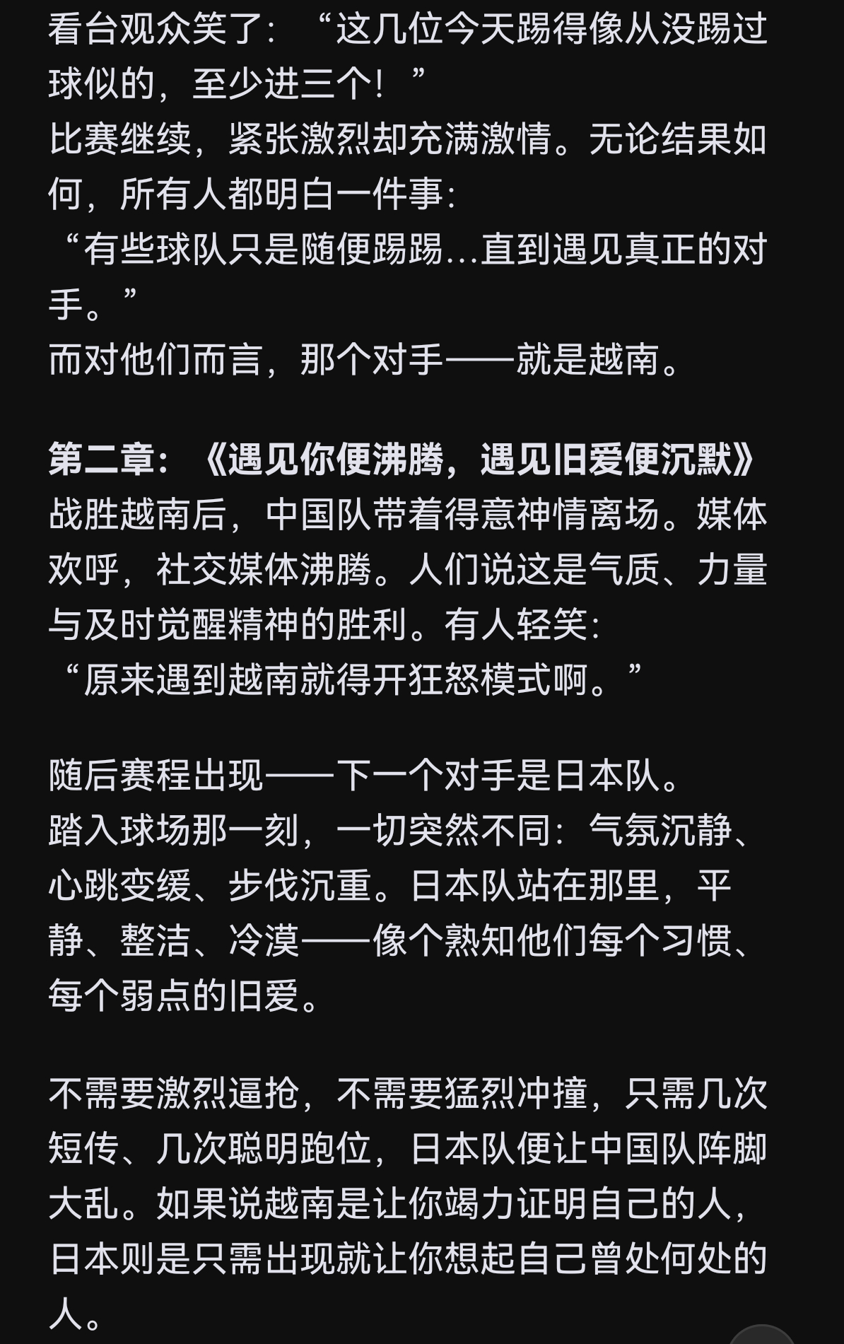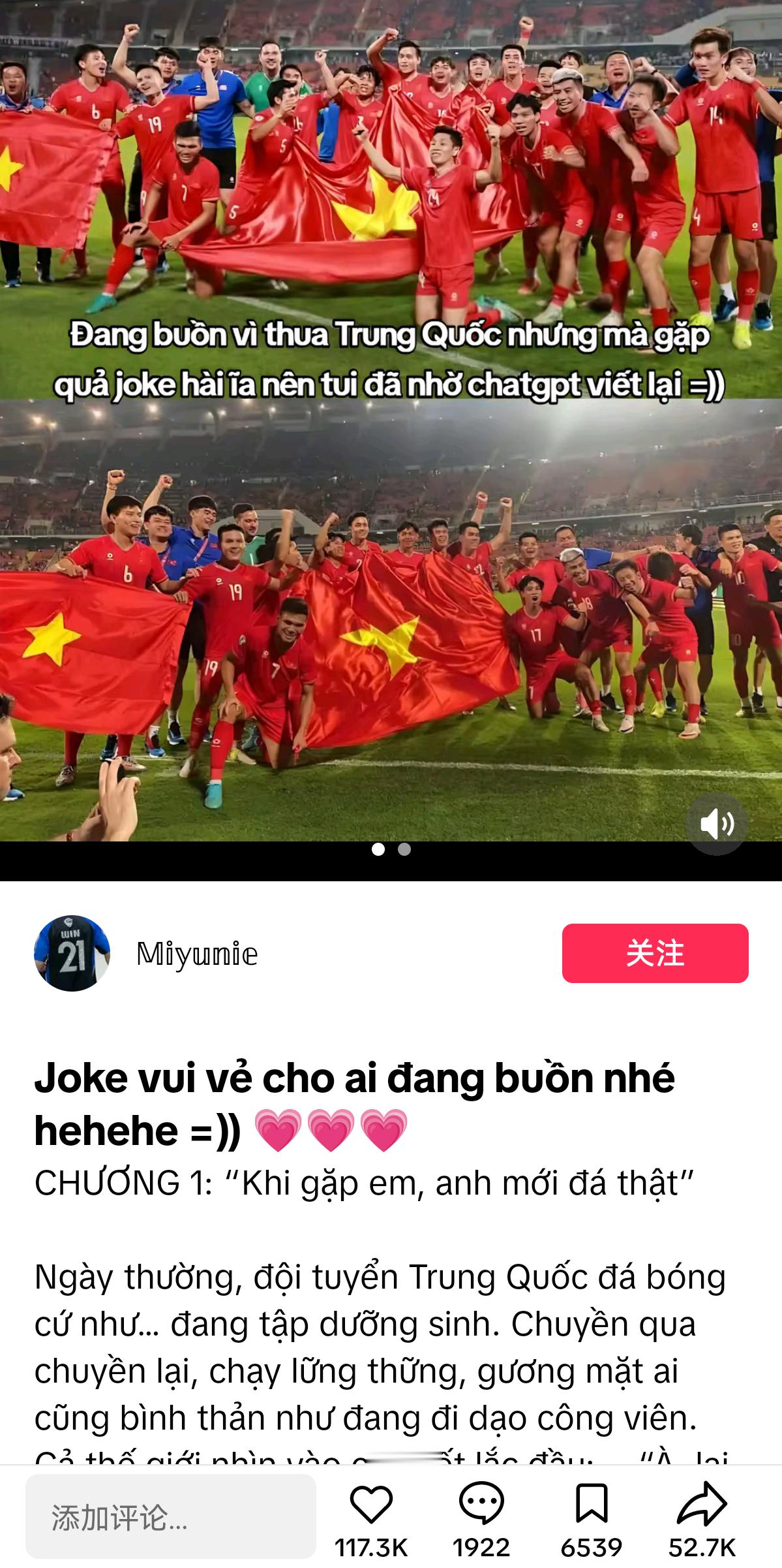 u23国足3:0碾压越南后,越南人开始在网上写震撼自嬷小作文——这篇奇文把越南描述成中国队的“新欢”,而把日本描述成曾经甩了中国的“旧爱”……说中国队只有遇见越南才会沸腾燃起斗志,而遇见日本只能无力的失败……目前这篇小作文外网已经11万赞了u23u23国足vs日本u23国足3比0越南u23