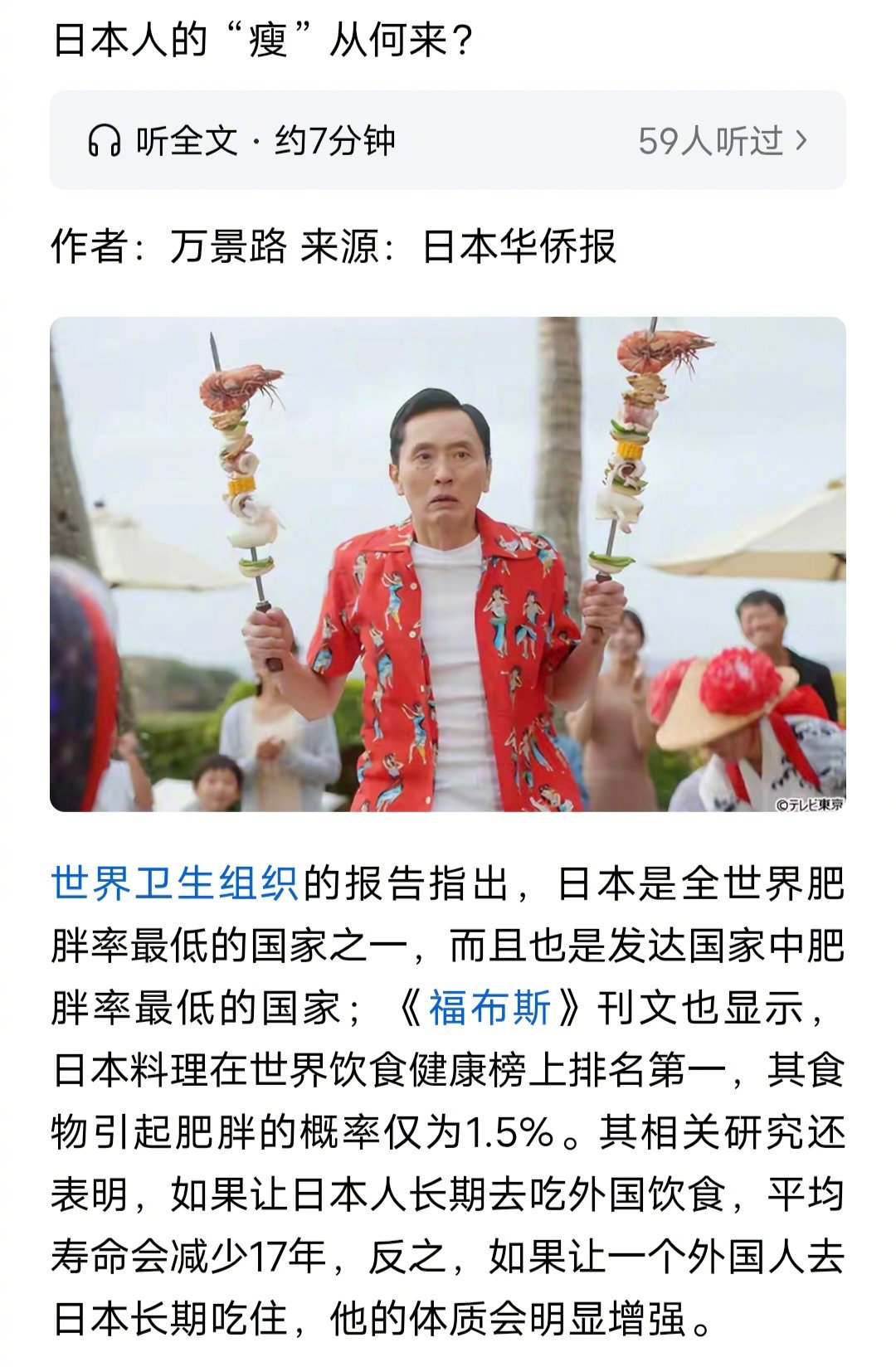 丧事喜办,日本人明明吃不饱饭,却美其名曰:日本是全世界肥胖率最低的国家之一,而且也是发达国家中肥胖率最低的国家,日本料理在世界饮食健康榜上排名第一,其食物引起肥胖的概率仅为1.5%。如果让日本人长期去吃外国饮食,平均寿命会减少17年,反之,如果让一个外国人去日本长期吃住,他的体质会明显增强。