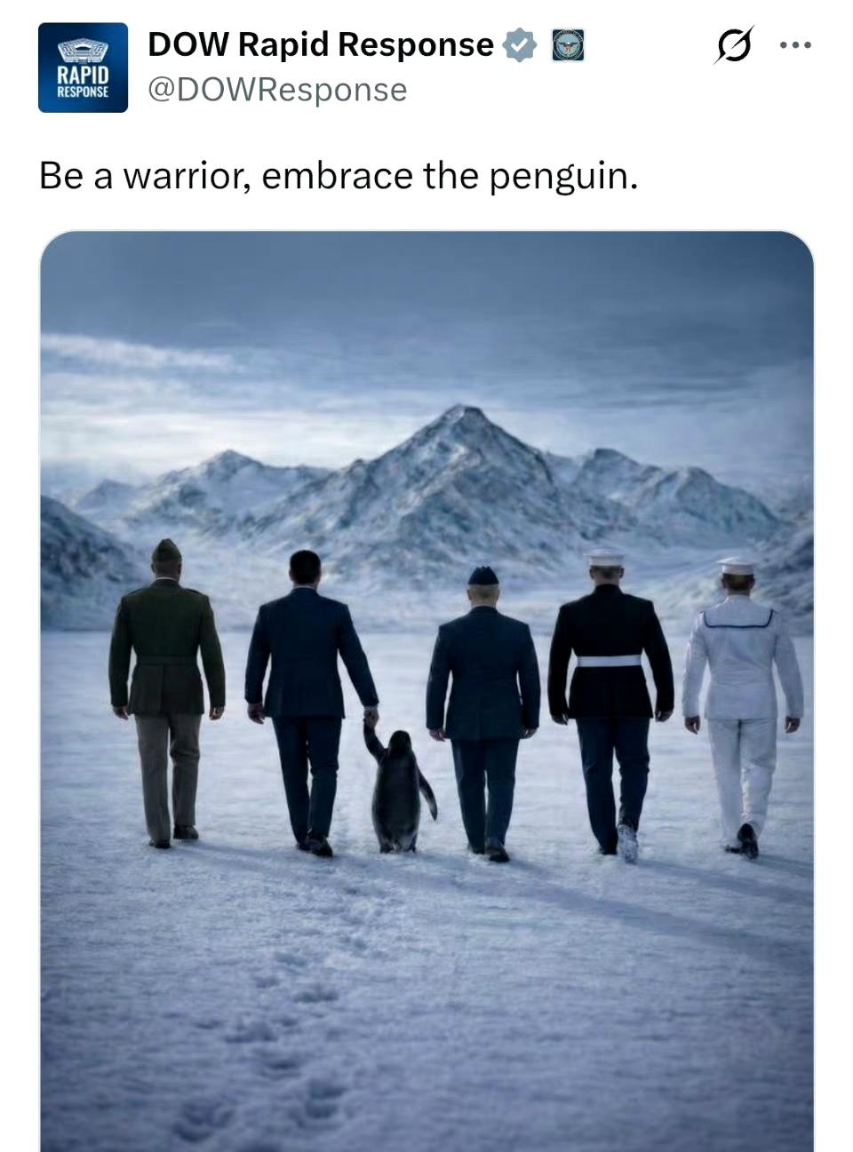 这是五角大楼官方账号发的图,配文:“做个勇士,拥抱企鹅”