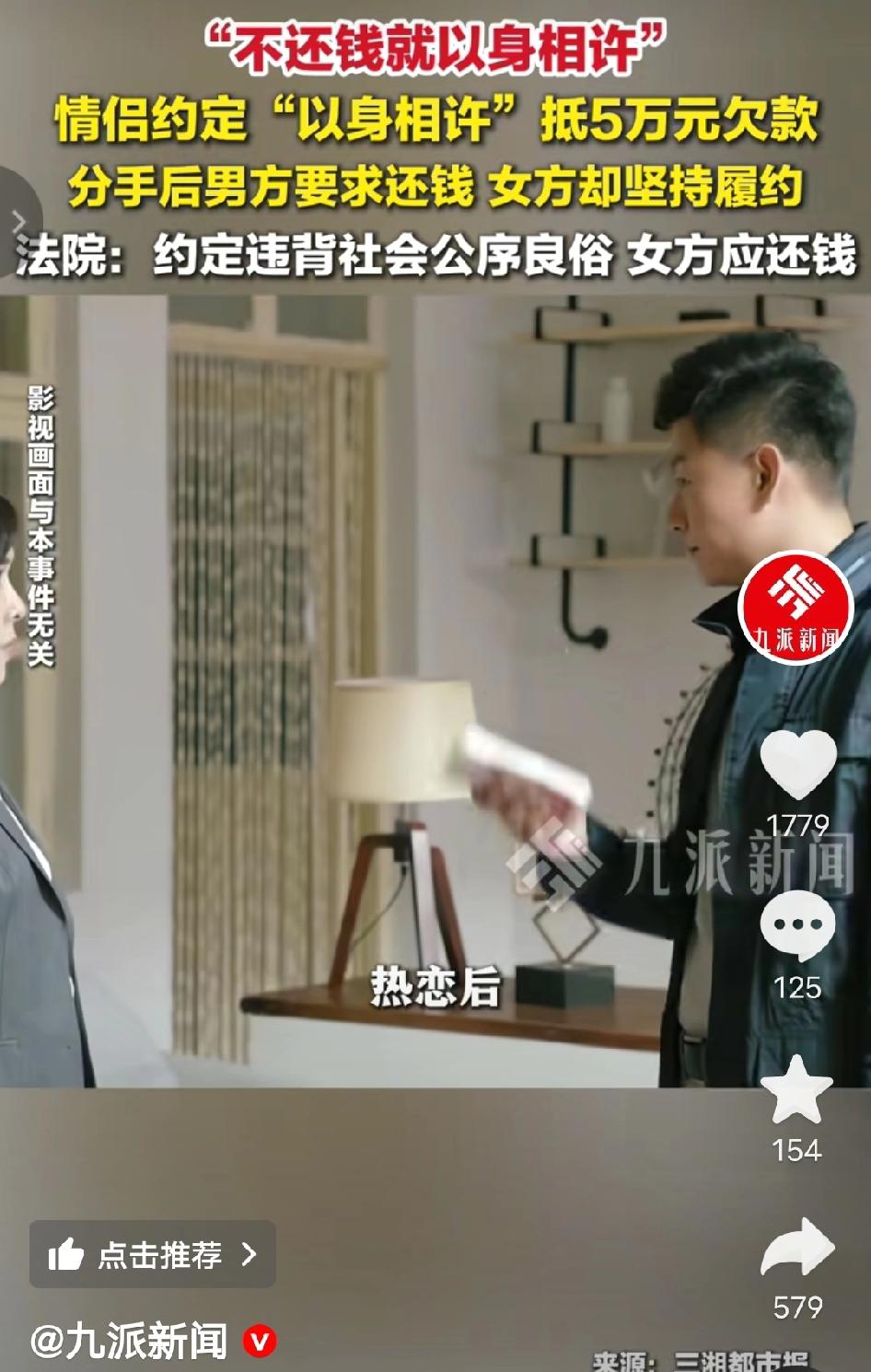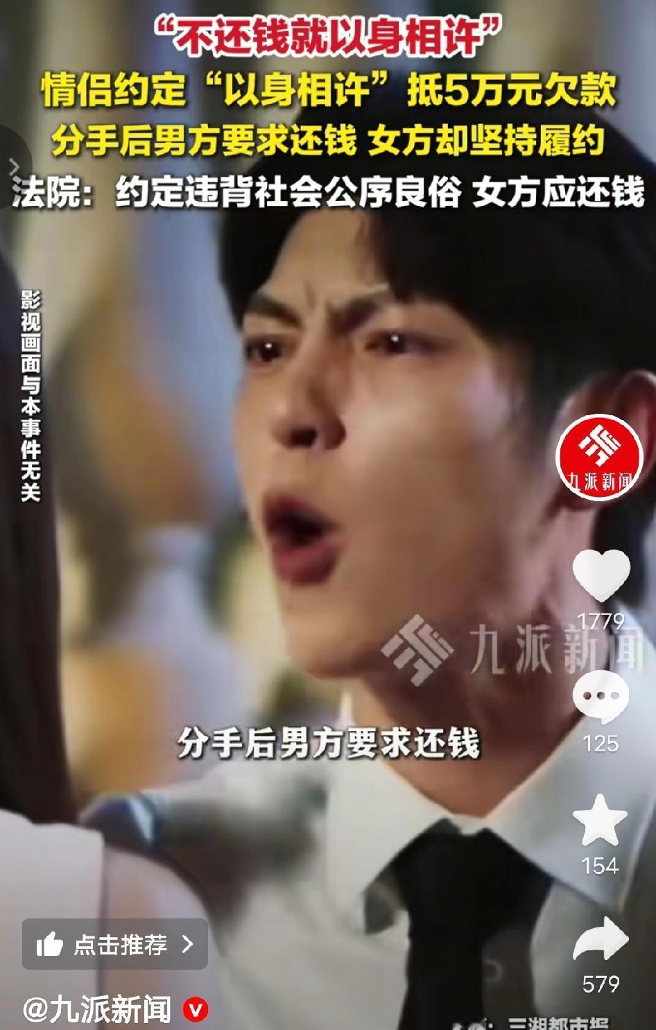 离谱到家了!湖南益阳,一对情侣约定,女方借5万到期不还就“以身相许”抵债。结果分手后男方要求还钱,女方却坚持按照约定来!最终男方告上法庭! 2024年初,湖南益阳的陈某与李某在一次朋友聚会上相识,很快陷入热恋。交往不久后,李某因经营的美甲店资金周转困难,向男友陈某提出借款5万元。 陈某当时有些犹豫,李某便撒娇着说:“你要是不放心,我们就写个协议——要是到期我还不上钱,就以身相许,一辈子陪着你抵债!” 两人在出租屋里,就着台灯写下了这份荒唐的协议,陈某还笑着调侃:“这可是你说的,到时候可别耍赖。” 2024年底,两人因频繁吵架分手。陈某整理物品时翻出了当初的借条,随即联系李某要求归还5万元欠款。 让他大跌眼镜的是,李某竟理直气壮地说:“我们当初签了协议的,不还钱就以身相许,我现在愿意兑现承诺,钱就不用还了!” 她甚至提出可以搬去陈某的出租屋,“履行约定”。 陈某觉得荒唐又愤怒,多次沟通无果后,将李某起诉至益阳市赫山区人民法院,要求她归还借款本金及利息。 庭审中,李某拿出那份协议辩称:“这是我们自愿签订的,当时感情好才这么约定,现在我愿意履约,凭什么还要还钱?” 但法院审理后明确表示:人身权利是公民的基本权利,不能作为债务的担保或抵债工具,“以身相许”的约定违背了社会公序良俗,从一开始就是无效的。 最终法院判决,借款关系合法有效,李某需归还陈某5万元本金及相应利息。 用“以身相许”来抵债,这种荒唐的约定你怎么看?如果是你,会接受这样的协议吗? 情侣约定以身相许抵债 法院判决违背公序良俗 争议民生 法律底线 益阳法院判决 来源:九派新闻及网络公开内容,如有侵权请联系即删 配图说明:本文配图/视频素材来自抖音@九派新闻,仅用于内容分享,侵权联删