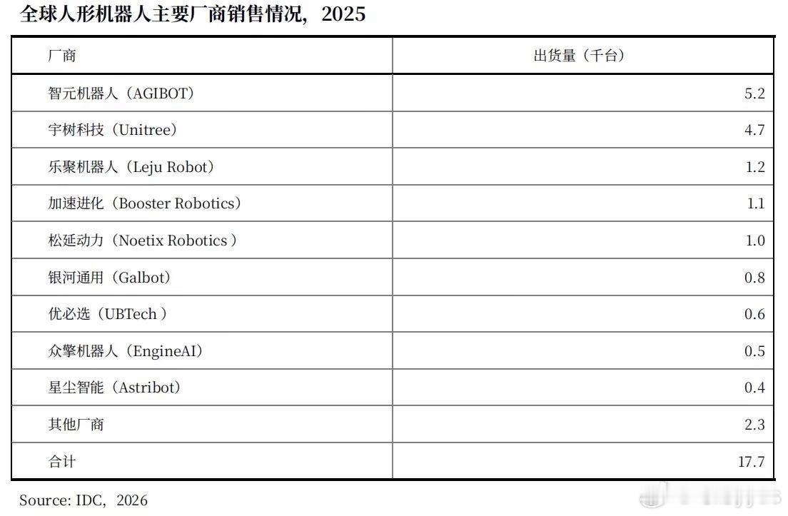 IDC发布2025年全球人形机器人销量数据:第一名,智元机器人,5.2k第二名,宇树科技,4.7k第三名,乐聚机器人,1.2k第四名,加速进化,1.1k第五名,松延动力,1k全年出货量约1.78万台,特斯拉optimus尚用于内部测试,没有出现在榜单中。