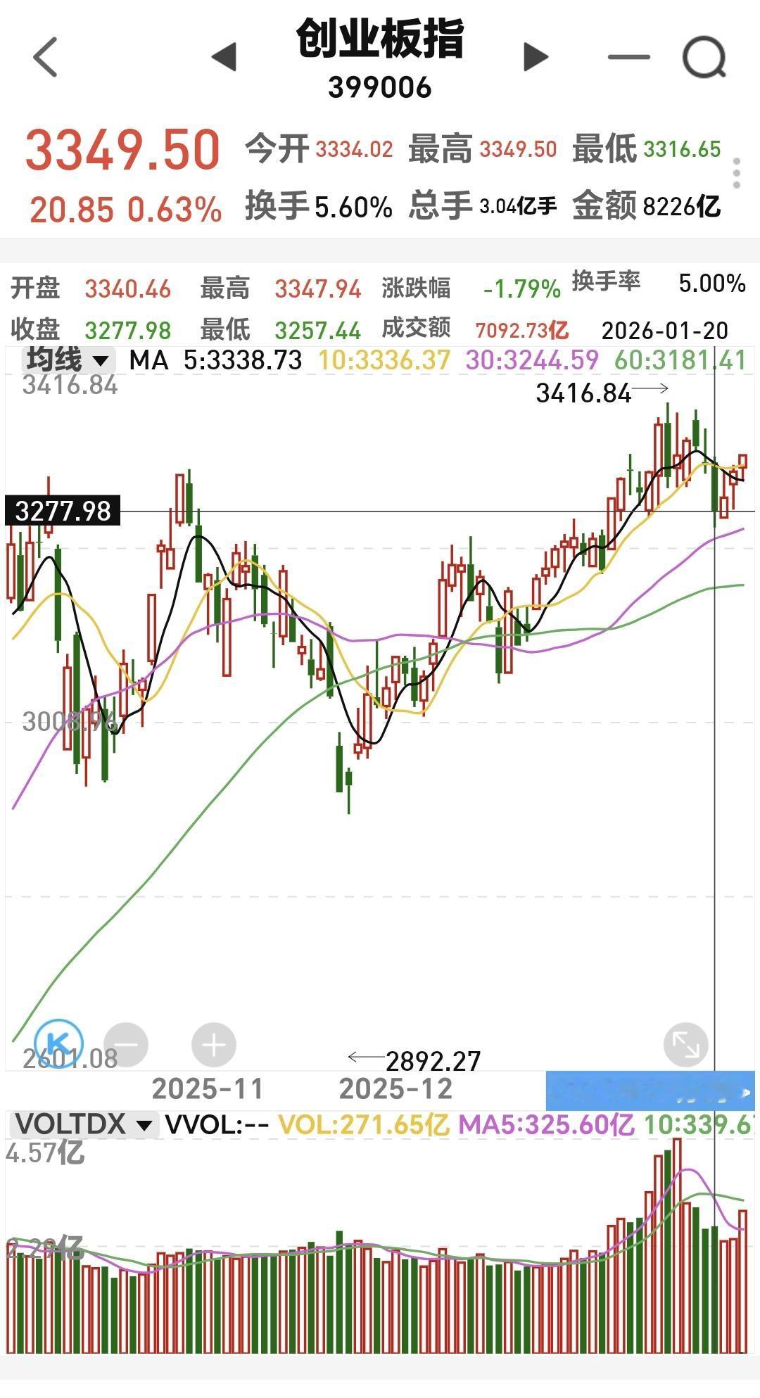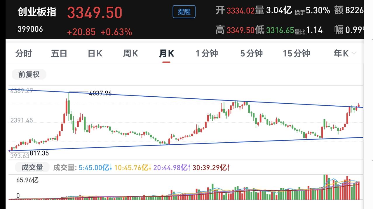 基金:创业板指的大方向向上 上证指数1月14号创了4190点新高,然后进行了调整,准确地说,在创新高的前一天就开始在调整了,1月20号的时候到达了第一轮调整的低点4080点,反弹到昨天盘中最高4143点。 调整的点位: 4190.87-4080.29=110.58点 反弹的点位: 4143.75-4080.29=63.46点 反弹的幅度 63.46÷100.58×100%=63.09% 反弹幅度超过了50%,也超过了61.8%,周五收在5天线之上,超短线看,没有看到市场存在问题,但谨防现在处于反弹之中,就是现在反弹不创新高,然后再次回落跌破4080点。 创业板指是1月13号创近几年新高3416点,调整到1月20号的最低3257点,谈到昨天的最高3349点。 调整的点位: 3416.84-3257.44=159.4点 反弹的点位: 3349.50-3257.44=92.06点 反弹的幅度: 92.06÷159.40=57.75% 反弹的幅度超过了50%,但没有超过61.80%,反弹也算是比较强的。 看下面的截图三,这是创业板指日K线图,现在的位置已经反弹到了上涨通道的下轨线上,下周观察是突破下轨线,重新回到上涨通道内,还是遇阻回落。 看下面的截图4,这是创业板指周K线图,最近两周是在上涨通道上轨线下方震荡,下周也是观察会不会遇阻回落,还是突破上涨通道的上轨线,进入加速上涨走势。 看下面的截图5,这是创业板指月K线图,本月到现在为止,也已经突破了长期以来压制创业板指上涨的反压线,本月剩下的时间观察现在的这个突破是真突破还是假突破。 创业板指周线级别的方向向上,创业板指的大方向向上,最起码到现在为止,还没有看到创业板指大方向有问题。 大家帮忙评论,点赞,转发和分享,谢谢大家的支持。
