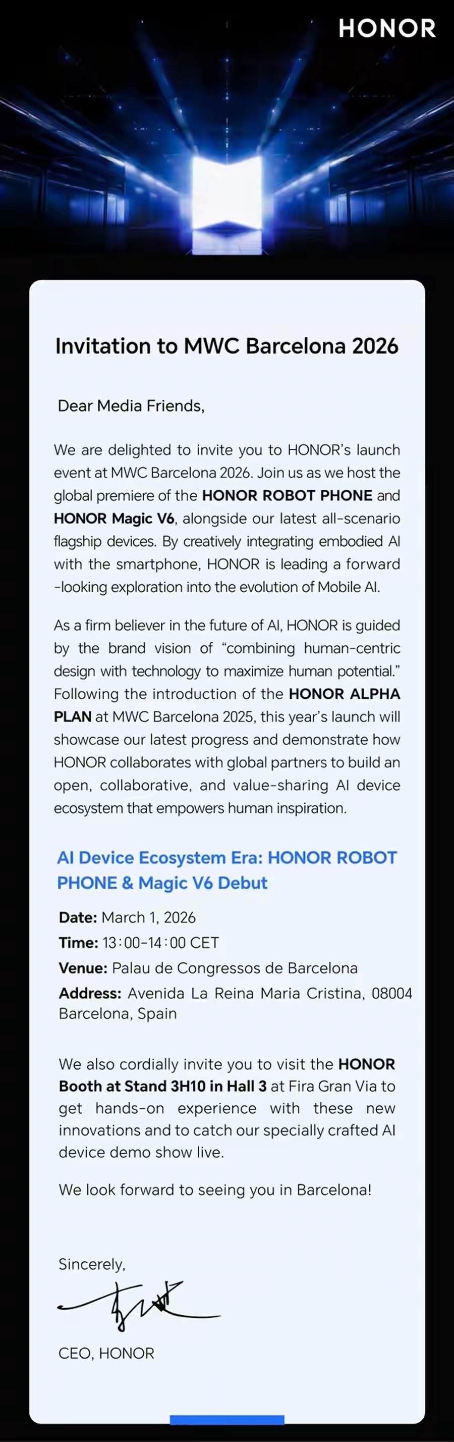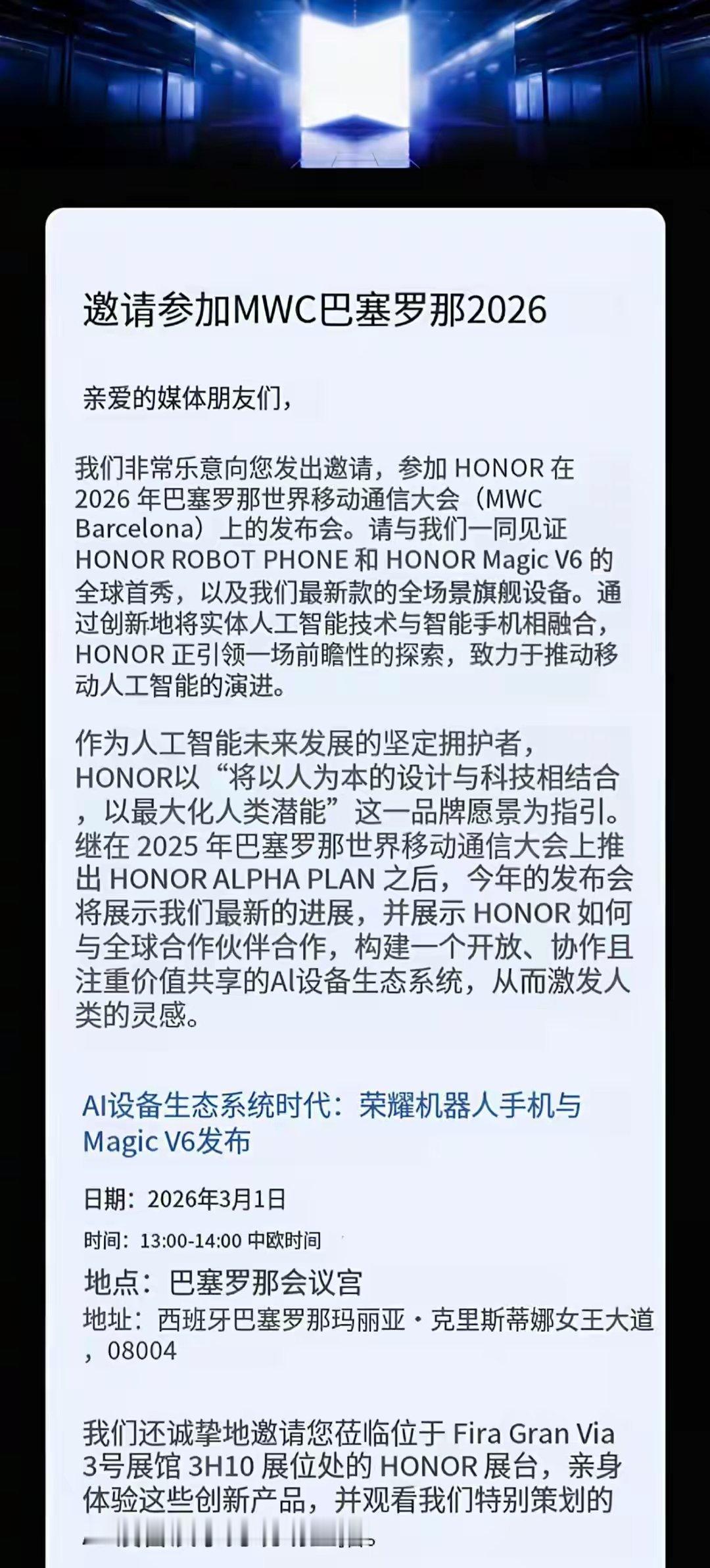 【荣耀Magic V6或于3月1日全球首发 发布会邀请函已流出】一封关于荣耀新品发布会的邀请函。该邀请函透露了荣耀将在2026年世界移动通信大会上举办新品发布会,届时ROBOT PHONE和Magic V6将迎来全球首发,发布会日期定在2026年3月1日。据爆料,荣耀Magic V6有望搭载高通骁龙8 Elite Gen5移动平台和2亿像素镜头。在续航上,7000毫安时级别电池使其有望成为2026年电池容量最大的折叠屏手机。屏幕素质也是荣耀Magic V6的一大亮点。该机有望采用京东方提供的柔性面板,内外双屏均支持2K+分辨率、5000尼特峰值亮度和高频PWM调光技术。除了荣耀Magic V6,此次发布的另一款产品ROBOT PHONE更是极具创新性。它融合了大模型AI大脑、机器人行动力和专业摄影云台,具备跨应用指令执行与实时跟随拍摄等先进功能,被视为手机形态的一次全新突破。荣耀方面曾表示,荣耀Magic8可看作是ROBOT PHONE的前身,是为未来AI终端生态埋下的种子,而ROBOT PHONE则可视为未来版的Magic8。据荣耀内部人士透露,ROBOT PHONE等前沿AI终端创新产品,将率先登陆荣耀阿尔法全球旗舰店。