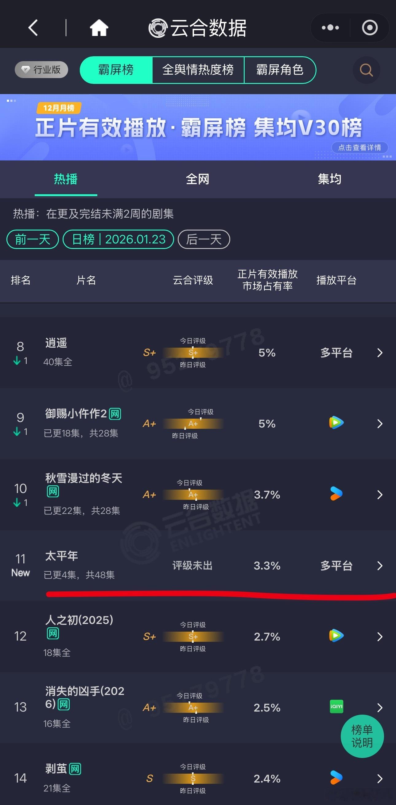 白宇、周雨彤主演的《太平年》首日云合飞榜了,三个平台,云合占比3.3%,血扑开局,这个样子集均1000万还得努努力。很好奇剧扑了,亏的钱算谁的?