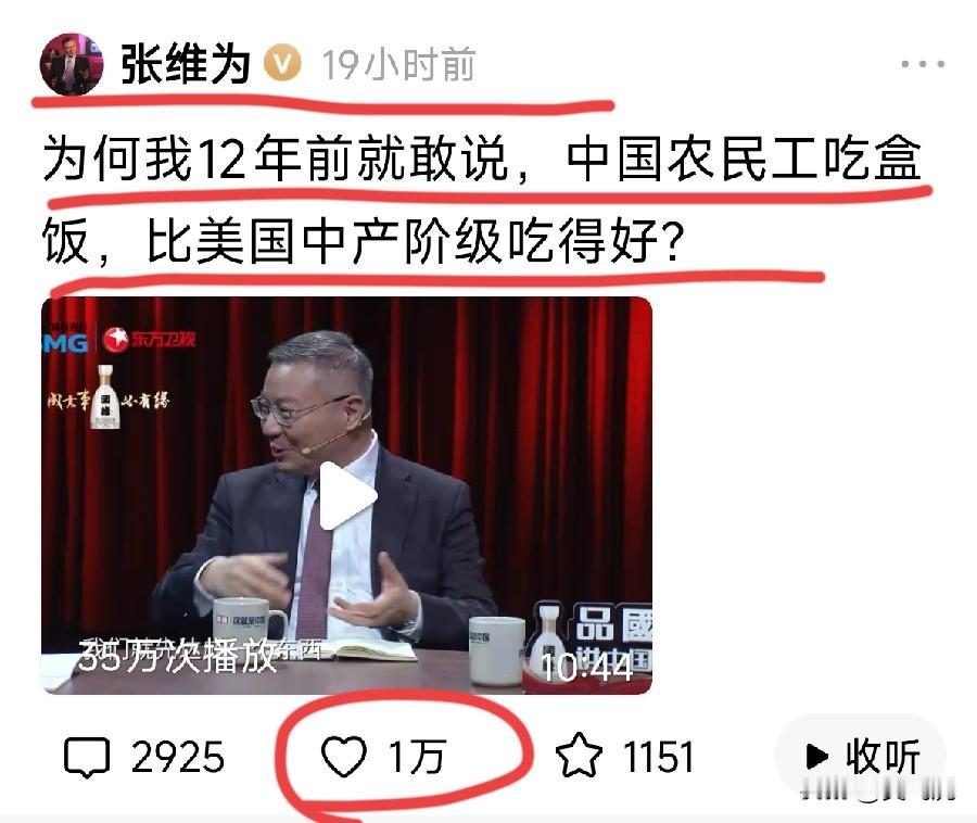 面对有观众提起“美国斩杀线” 张维为再提12年前的说法: 东大的农民工吃盒饭 比美国中产吃的好。