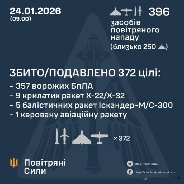 拦截率93.9%,乌克兰防空站起来了——当地时间1月23日晚,就在俄,美,乌三方在阿联酋阿布扎比就“乌克兰问题”举行三方谈判之际,俄罗斯对乌克兰多地实施了大规模空袭。 据乌克兰空军报告称,此次空袭,俄罗斯向乌克兰发射了包括各种无人机,导弹,共计396个打击手段。 袭击目标包括:切尔尼戈夫州、哈尔科夫州、波尔塔瓦州、第聂伯罗彼得罗夫斯克州、苏姆州、扎波罗热州、切尔卡斯州、日托米尔州及基辅州均发出了空袭警报。 主要目标是乌克兰首都基辅。 乌克兰空军报告称,在袭击过程中,乌克兰防空部队总共拦截并干扰了372个空中目标。其中,俄罗斯在此次袭击中动用了海陆空三种打击手段,其中包括: 2枚3M22“锆石”反舰导弹(无一被拦截) 12枚Kh-22/Kh-32巡航导弹(其中9枚被拦截或被电子干扰系统破坏) 6枚伊斯坎德尔-M/S-300弹道导弹(其中5枚被拦截或被电子干扰系统破坏)。 1枚Kh-59/Kh-69空对地导弹(其中1枚被拦截或被电子干扰失效) 375架无人机(其中357架被拦截或被干扰系统破坏) 乌克兰空军表示,其中2枚导弹及18架无人机在17个地点遭到了袭击;被击落的飞行器残骸坠落在12个地点。 经过计算,此次乌克兰的拦截率高达94%……