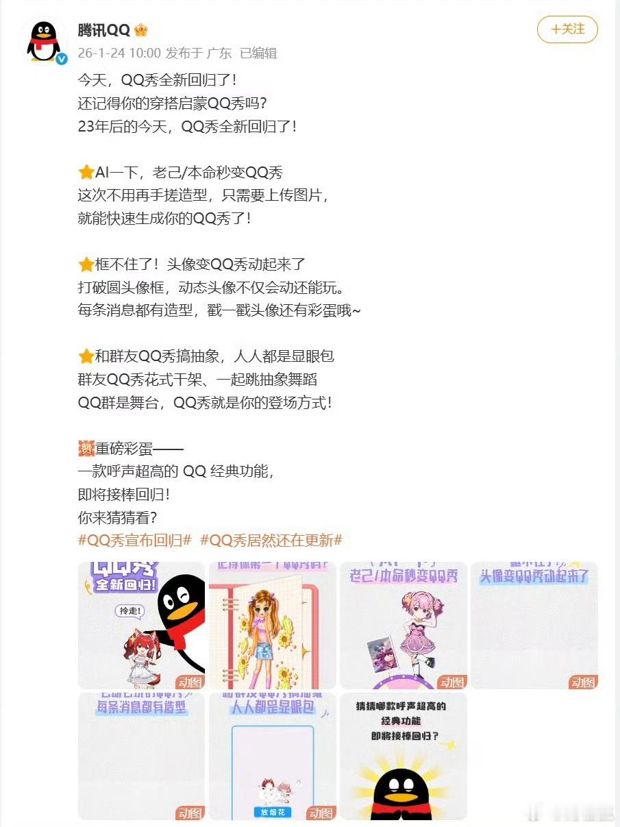 如果QQ秀能穿越,你想给2003年的自己什么建议?刚刚,腾讯QQ官宣QQ秀重磅回归,瞬间炸出一波“回忆杀”。23年前那个让80后、90后熬夜充红钻、狂搭杀马特造型的虚拟形象功能,如今带着AI黑科技杀回江湖——上传照片就能一键生成动态小人,群聊还能组团跳抽象舞!这波操作直接让网友破防:当年省早饭钱买的荧光绿套装,现在看简直羞耻到脚趾抠地!要是能穿越回2003年,你会对那个沉迷QQ秀的自己说什么?社交媒体上瞬间掀起脑洞风暴。有网友痛心疾首:“千万别买那个爆炸头配铆钉裤!截图现在还在同学群流传!”更有人化身理财大师:“囤绝版限定啊!当年‘冰雪女王’套装现在能换十个黄钻!”最扎心的莫过于技术党提醒:“记得把‘傷嗐→卟瑏’的个性签名截图保存,十年后你会需要它做黑历史PPT。”翻开古早QQ秀审美图鉴,简直就是一部互联网时尚灾难史。当年觉得炫酷的荧光粉配亮紫“彩虹渐变”,如今看像打翻调色盘;非主流时期最火的“颓废风”造型,破洞牛仔裤搭配金属链子,现在被调侃为“葬爱家族入职套装”。最绝的是文字装饰功能,人人都在胸前P上“偶嘚丗堺伱卟懂”,活脱脱一部青春疼痛文学实体化。腾讯这波回归显然摸透了用户心理。新版QQ秀不仅能AI生成形象,还解锁了“动态头像打架”“群聊斗舞”等沙雕玩法。但老用户们更怀念的,或许是当年那个认真研究“如何用5Q币搭出贵族气质”的自己。有网友深情留言:“建议告诉2003年的我,别嫌红钻太贵——那是你未来最便宜的快乐。”从手动捏脸到AI造人,QQ秀的进化史恰好印证了那句“时尚是个轮回”。当年觉得土掉渣的千禧风,如今被元宇宙NFT捧成前卫艺术;曾经羞于启齿的“黑历史”,现在成了Z世代追捧的复古潮流。或许真正的建议应该是:放心大胆地丑吧!那些现在让你脚趾抠地的造型,终将成为未来最珍贵的数字文物。所以问题来了:如果真能穿越,你最想抢救哪套QQ秀神装?是绝版“幻彩翅膀”,还是限定“至尊红钻套装”?评论区已化身大型赛博考古现场——毕竟,谁还没为虚拟世界里的自己心动过呢?QQ秀宣布回归