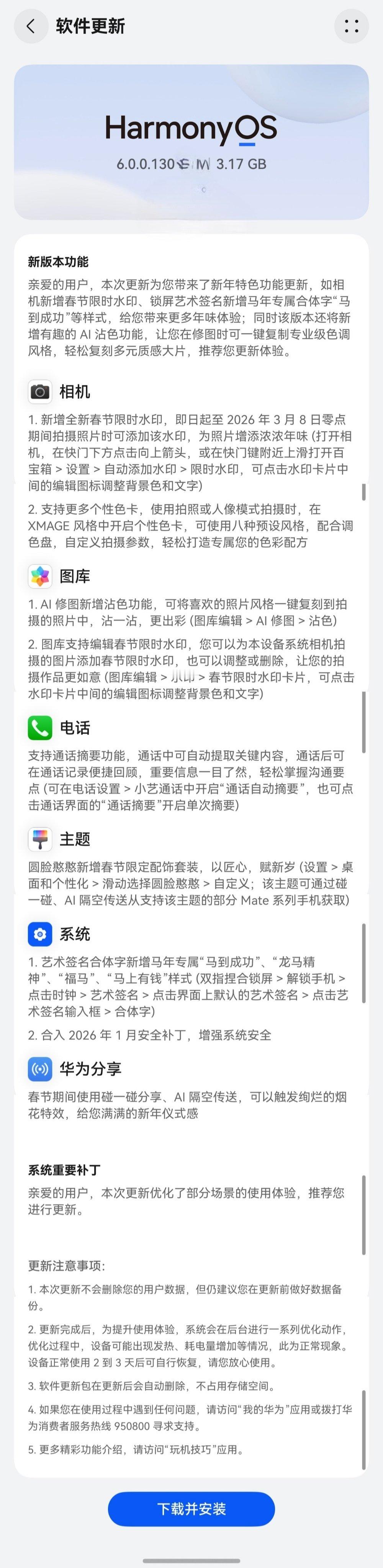 【华为鸿蒙 HarmonyOS 6.0.0.130 版本开推,首批覆盖 Mate 60 / 70 / 80、Pura 70 / 80 等】华为面向 Mate 60 / 70 / 80、Pura 70 / 80 等机型首批推送了鸿蒙 HarmonyOS 6.0.0.130 版本更新,系统包大小约 3.17GB,带来了春节限时水印、AI 沾色等功能(机型不同,部分功能有所差异)。附华为鸿蒙 HarmonyOS 6.0.0.130 版本更新内容如下:相机1.新增全新春节限时水印,即日起至 2026 年 3 月 8 日零点期间拍摄照片时可添加该水印,为照片增添浓浓年味 (打开相机,在快门下方点击向上箭头,或在快门键附近上滑打开百宝箱> 设置 > 自动添加水印 > 限时水印,可点击水印卡片中间的编辑图标调整背景色和文字)2.支持更多个性色卡,使用拍照或人像模式拍摄时,在 XMAGE 风格中开启个性色卡,可使用八种预设风格,配合调色盘,自定义拍摄参数,轻松打造专属您的色彩配方图库1.AI 修图新增沾色功能,可将喜欢的照片风格一键复刻到拍摄的照片中,沾一沾,更出彩 (图库编辑> AI 修图 > 沾色)2.图库支持编辑春节限时水印,您可以为本设备系统相机拍摄的图片添加春节限时水印,也可以调整或删除,让您的拍摄作品更如意 (图库编辑> 水印 > 春节限时水印卡片,可点击水印卡片中间的编辑图标调整背景色和文字)电话支持通话摘要功能,通话中可自动提取关键内容,通话后可在通话记录便捷回顾,重要信息一目了然,轻松掌握沟通要点 (可在电话设置> 小艺通话中开启“通话自动摘要”,也可点击通话界面的“通话摘要”开启单次摘要)主题圆脸憨憨新增春节限定配饰套装,以匠心,赋新岁 (设置> 桌面和个性化 > 滑动选择圆脸憨憨 > 自定义; 该主题可通过碰一碰、AI 隔空传送从支持该主题的部分 Mate 系列手机获取)系统1.艺术签名合体字新增马年专属“马到成功”、“龙马精神”、“福马”、“马上有钱”样式 (双指捏合锁屏> 解锁手机 > 点击时钟 > 艺术签名 > 点击界面上默认的艺术签名 > 点击艺术签名输入框 > 合体字)2.合入 2026 年 1 月安全补丁,增强系统安全华为分享春节期间使用碰一碰分享、AI 隔空传送,可以触发绚烂的烟花特效,给您满满的新年仪式感系统重要补丁亲爱的用户,本次更新优化了部分场景的使用体验,推荐您进行更新。更新注意事项:1.本次更新不会删除您的用户数据,但仍建议您在更新前做好数据备份。2.更新完成后,为提升使用体验,系统会在后台进行一系列优化动作,优化过程中,设备可能出现发热、耗电量增加等情况,此为正常现象。设备正常使用 2 到 3 天后可自行恢复,请您放心使用。3.软件更新包在更新后会自动删除,不占用存储空间。4.如果您在使用过程中遇到任何问题,请访问“我的华为”应用或拨打华为消费者服务热线 950800 寻求支持。5.更多精彩功能介绍,请访问“玩机技巧”应用。下载并安装华为目前常采用分批的方式进行升级推送,未收到更新的用户需继续等待。
