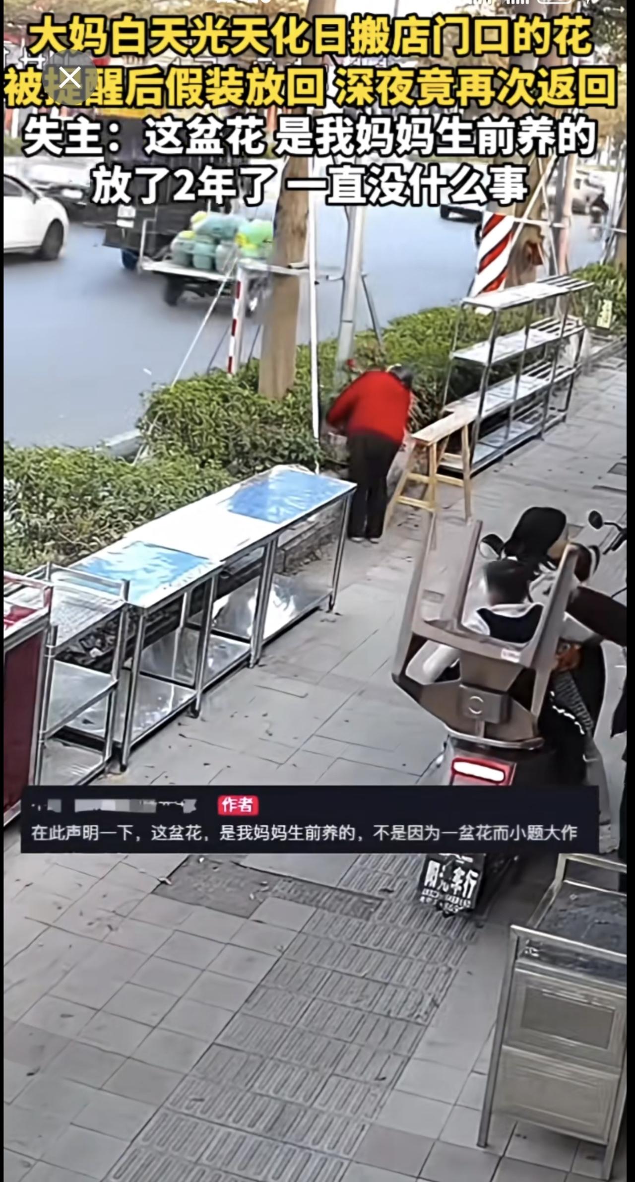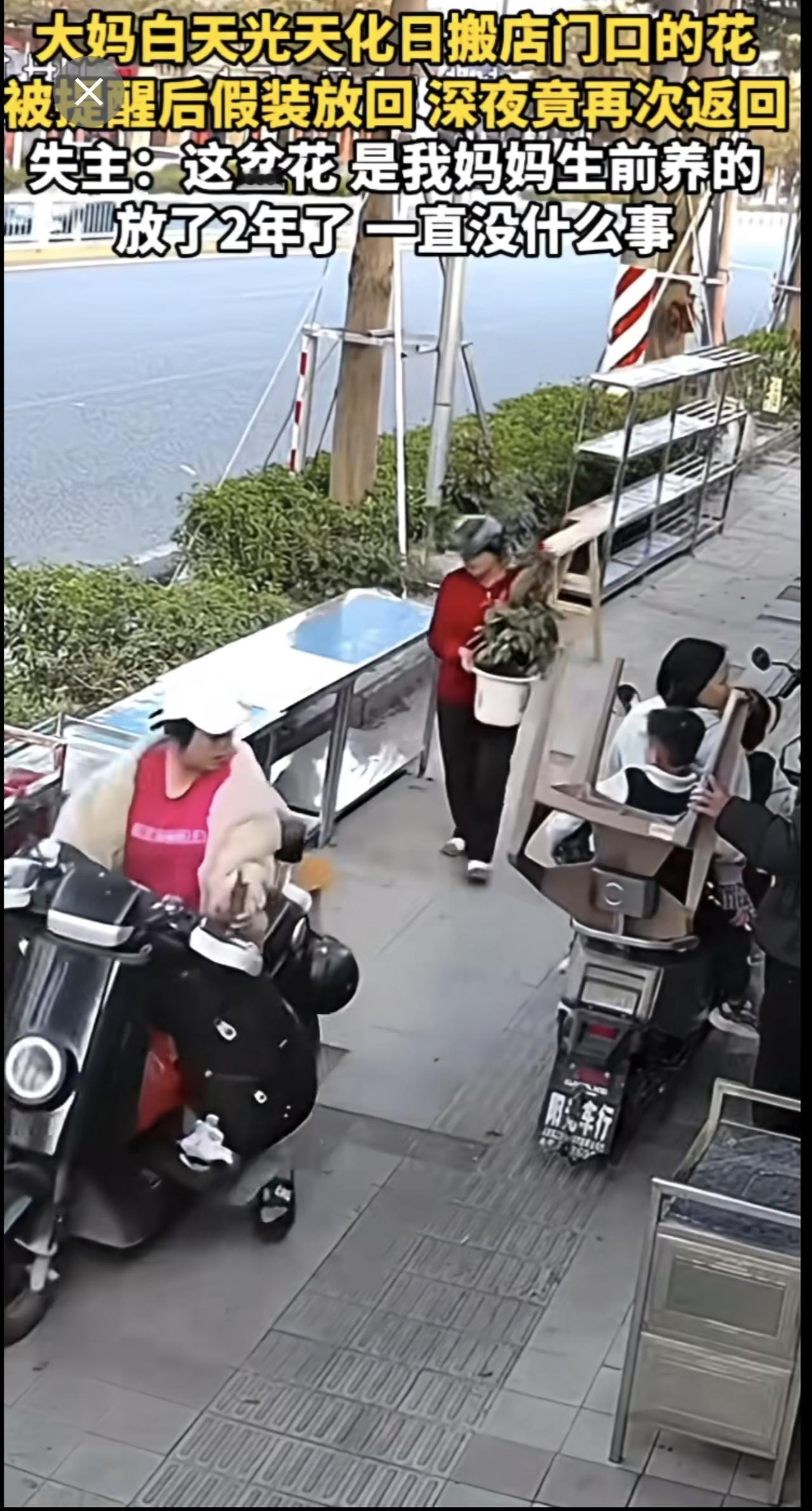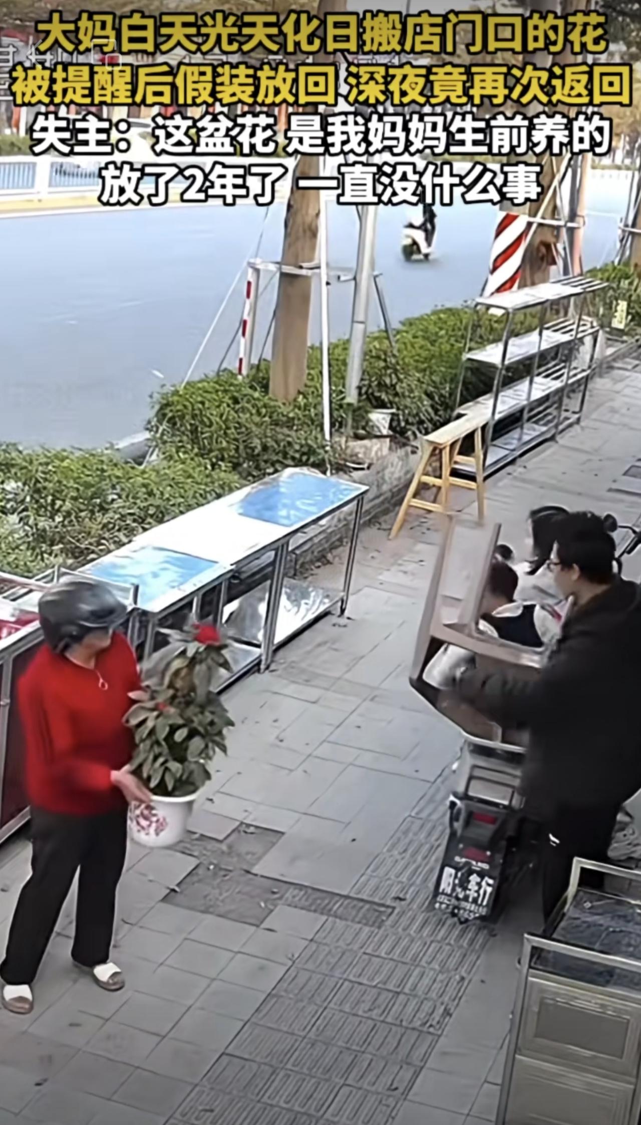 大妈白天光天化日搬店门口的花 被提醒后假装放回深夜竟再次返回