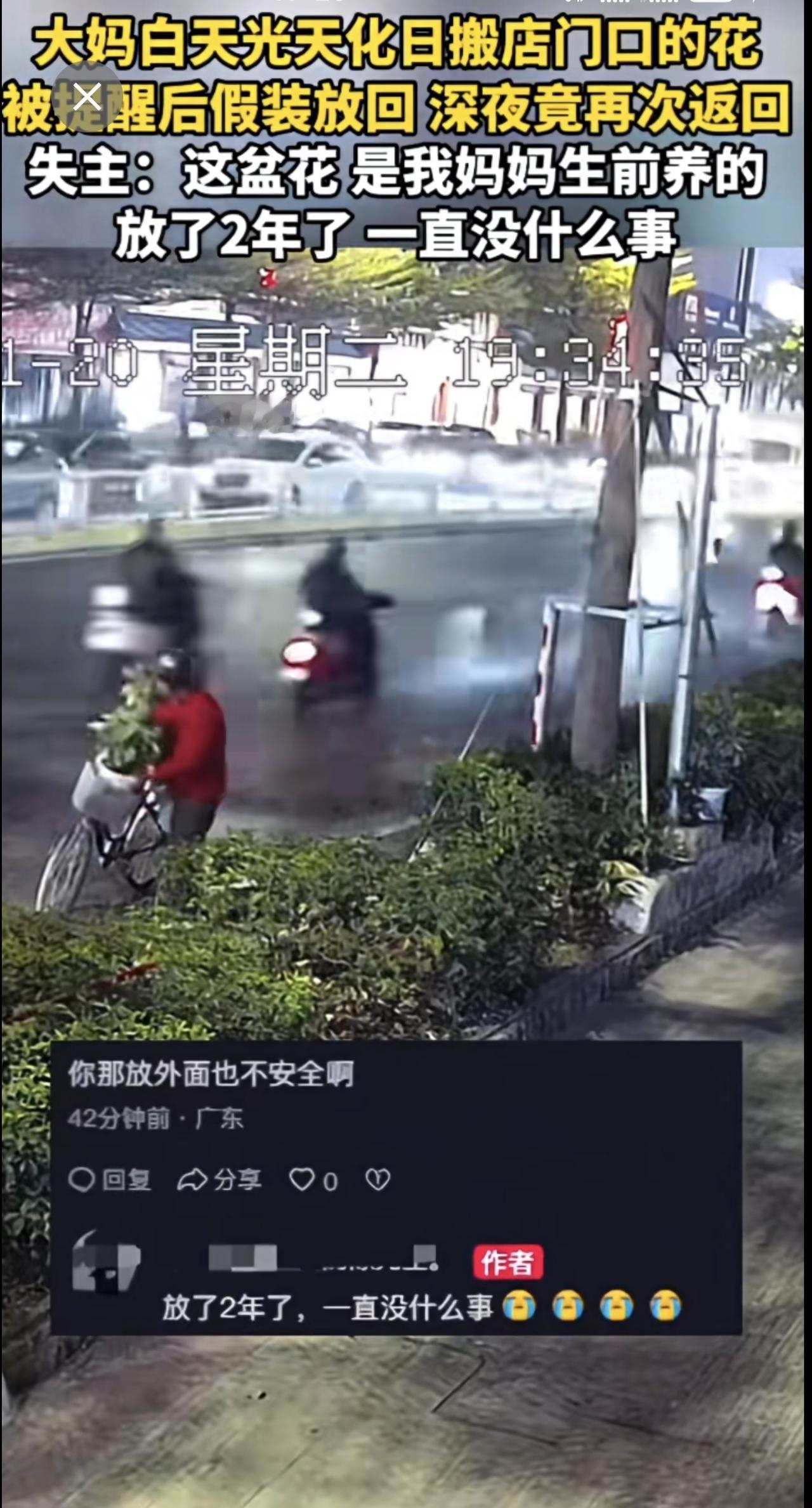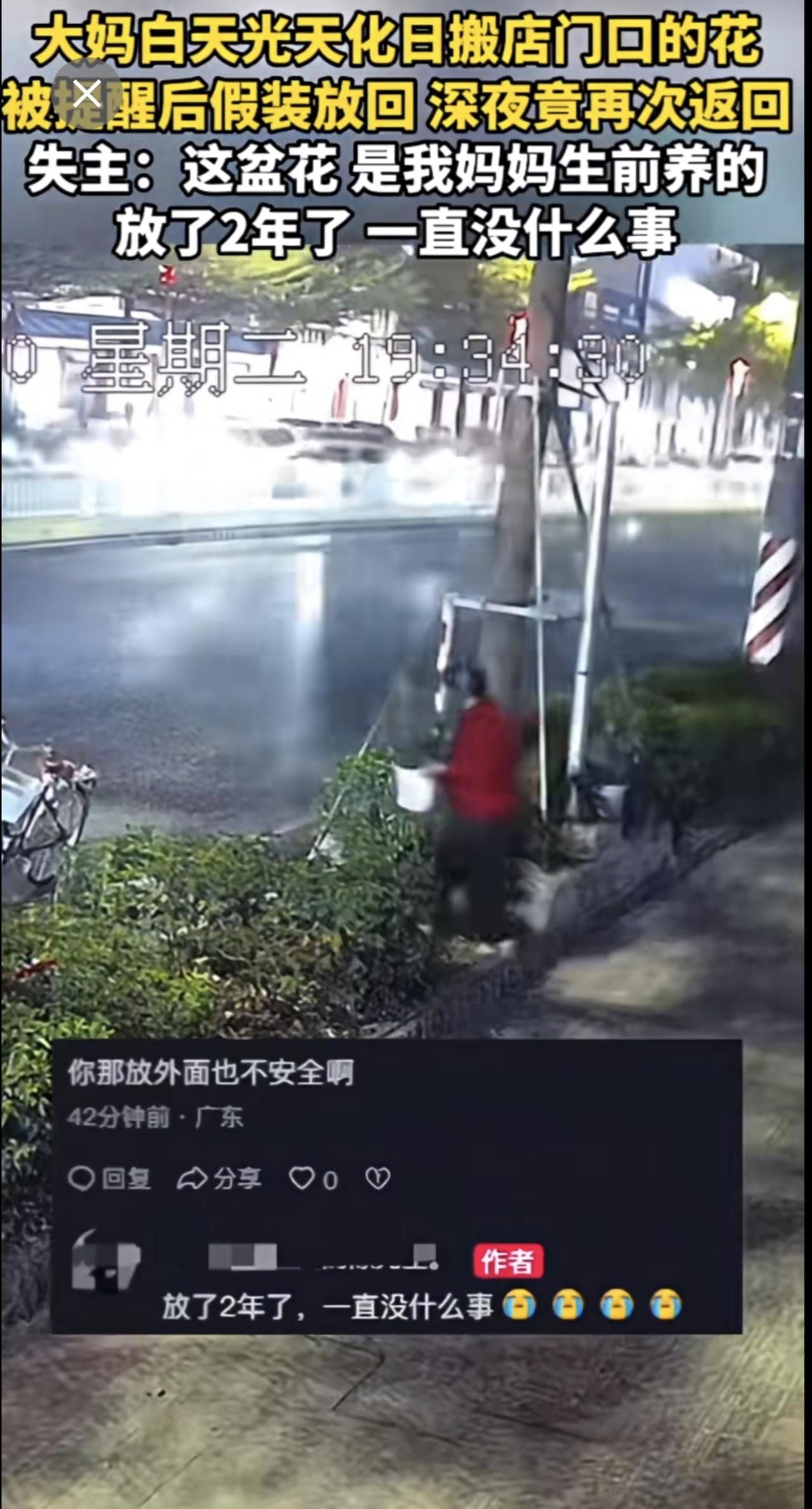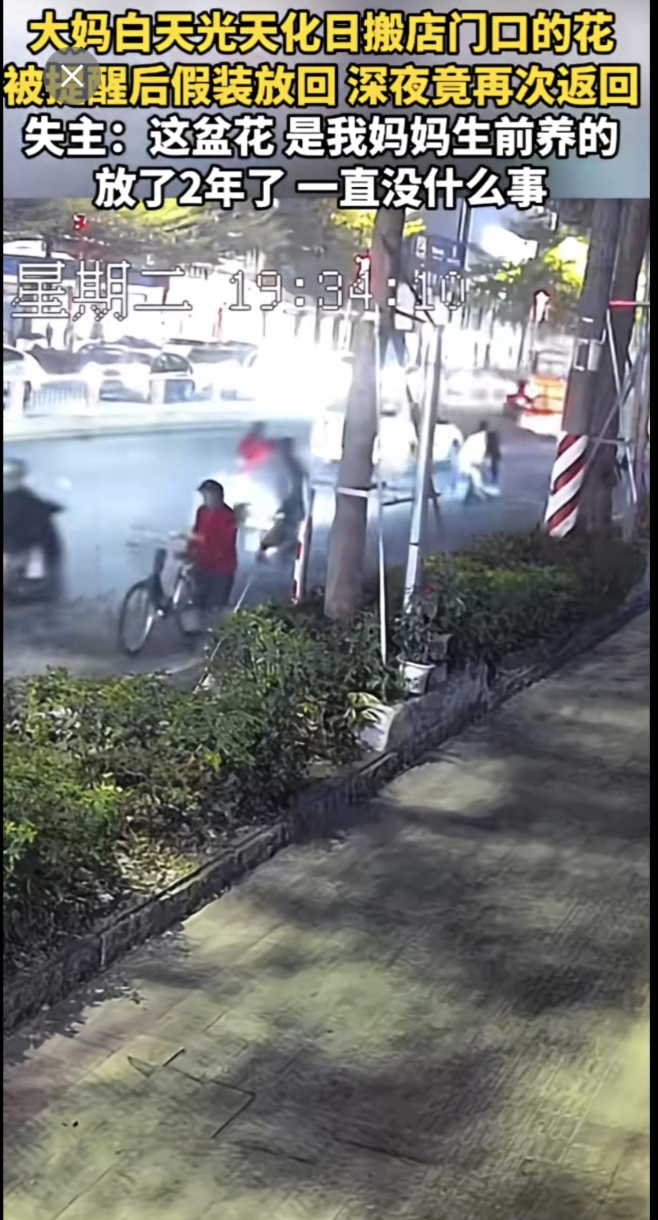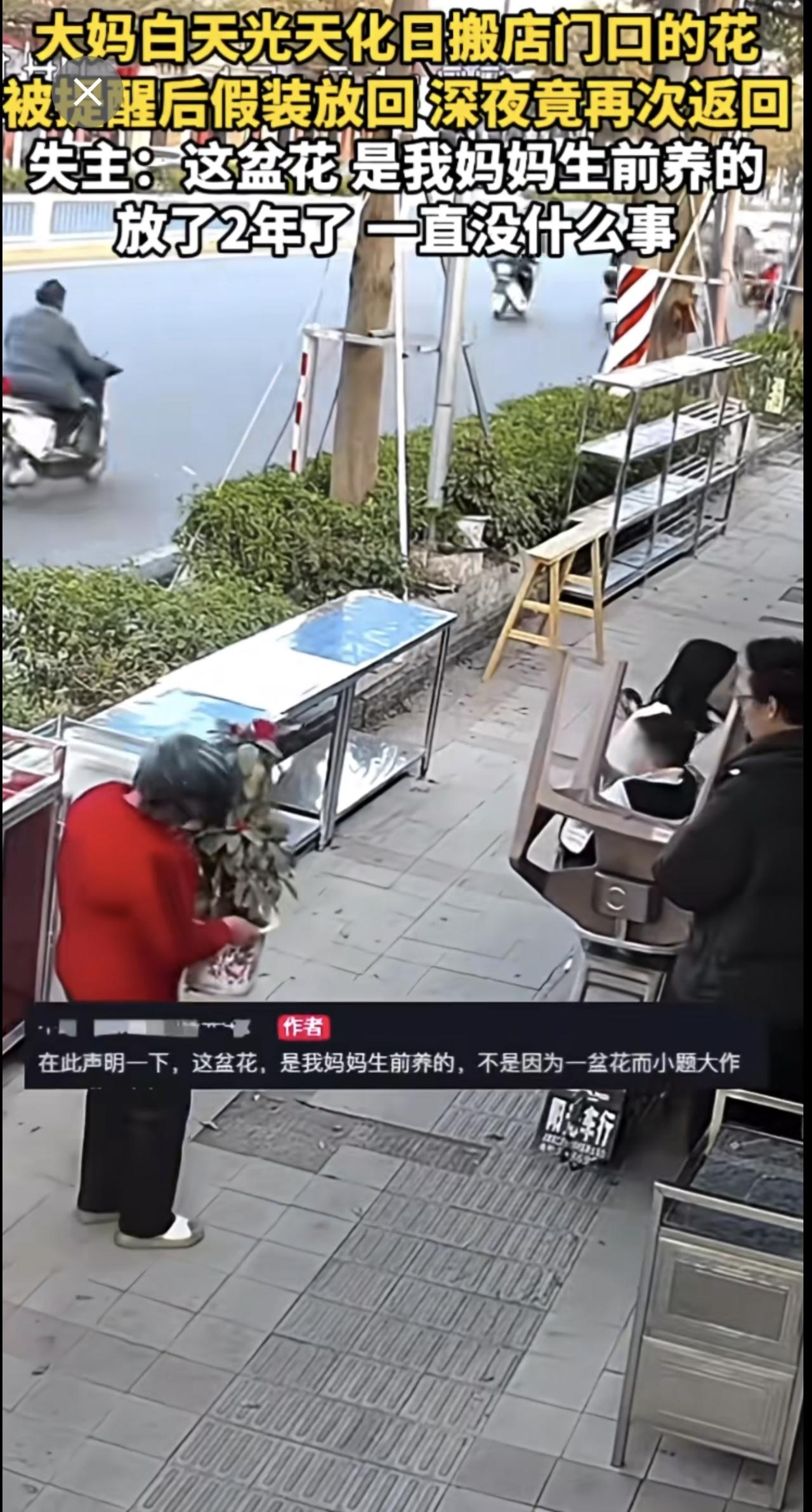 大妈白天光天化日搬店门口的花 被提醒后假装放回深夜竟再次返回