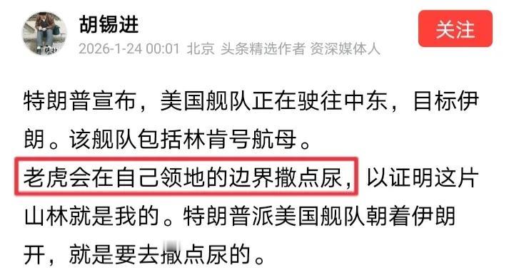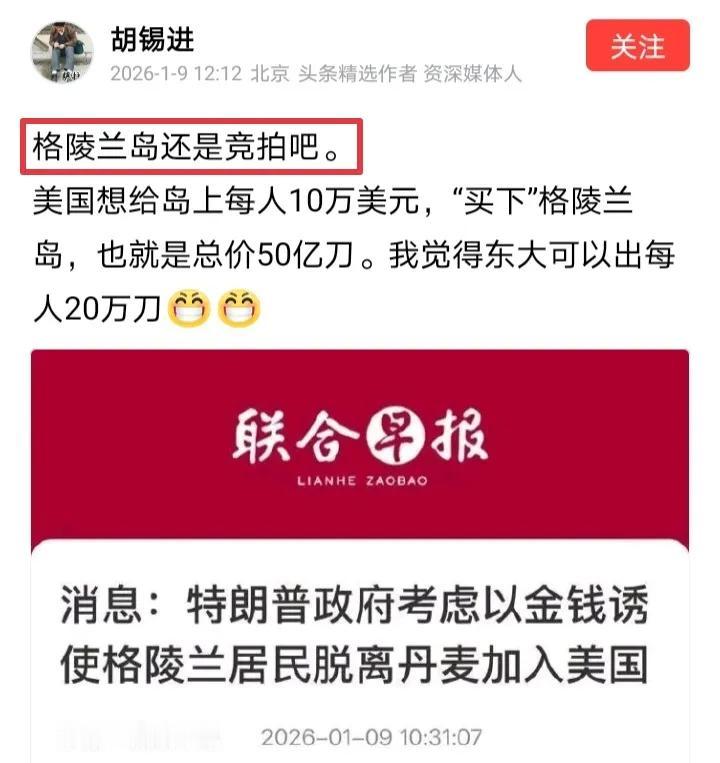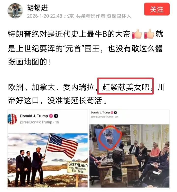 对于美国侵犯他国主权的恶行,胡锡进竟然不是强烈谴责而是嬉皮笑脸,这是怎么回事呢? 原来近期美国屡次霸凌其他中小国家,胡锡进却插科打诨,讲一些荤段子,从而回避美国的罪责。 比如美国侵略委内瑞拉绑架了委国总统马杜罗,胡锡进就轻佻地喊话委内瑞拉等国“赶紧献美女”,可见老胡关心美女胜过关心委国主权。 又如美国企图侵占丹麦治下的格陵兰岛,胡锡进就声称各国可以来竞拍格陵兰,相比美国“给岛上每人10万美元”,老胡表示我们“可以出每人20万刀”。 再如美国派出舰队意图侵犯伊朗,胡锡进就说“老虎会在自己领地的边界撒点尿”,显然老胡的意思是这没什么大不了的,只不过撒泡尿而已。 从前胡锡进在美国的纽约街头张开双臂,尽情地呼吸香甜自由的空气,可见老胡在美国的日子是多么的享受和惬意。 那么胡锡进如此轻浮地对待美国的侵略行径,老胡是把他国主权当作儿戏吗?