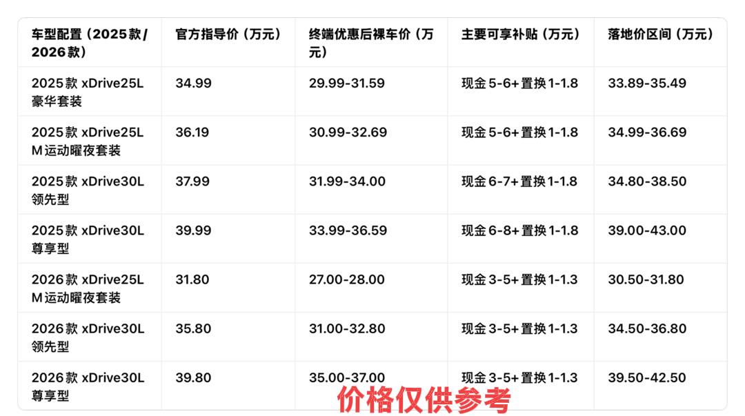 最近抽空去宝马4S店逛了逛,主要想了解热门中型SUV宝马X3的真实价格行情,毕竟很多人买车最关心的还是“多少钱能落地”。经过和销售详细沟通,再结合近期收集的市场信息,整理出一份实实在在的价格解析,希望能给意向车主提供参考。 ⬇️⬇️⬇️ 目前宝马X3同时在售2025款和2026款车型,两者价格体系有明显差异。2026款作为新款,官方指导价区间在31.8万-39.8万元,相比老款有不同程度的官方降价,顶配车型降幅超过5万元。而2025款正处于清库存阶段,优惠力度更大,官方指导价34.99万-39.99万元的车型,终端裸车价普遍能下探到29.99万-34.19万元,部分配置优惠后甚至低于30万元,性价比相当突出。 ⬇️⬇️⬇️ 终端优惠方面,现金折扣是最直接的让利。2026款车型目前现金优惠普遍在3万-5万元,入门款xDrive25L M运动曜夜套装优惠后裸车价约27万-28万元;2025款清库车型优惠幅度更大,部分配置能达到5万-8万元,个别经销商甚至给出更高折扣。除了现金优惠,全国性的补贴政策也值得关注,报废国四及以下燃油车换购可享1.5万元补贴,该政策持续到2025年底,符合条件的消费者能进一步节省成本。 ⬇️⬇️⬇️ 置换和金融政策也是降低购车门槛的重要方式。置换补贴方面,同品牌置换至高可享1.8万元礼遇,跨品牌置换也有1万-1.3万元补贴,部分地区还能叠加地方置换补贴,最高可累计2.6万元。金融方案则相当灵活,首付比例低至5%-10%,最长可分60期还款,部分车型支持3年免息或0.88%超低利率,以入门款为例,首付30%约8.4万元,月供可控制在5000元左右,对预算有限的消费者很友好。 ⬇️⬇️⬇️ 落地价构成方面,以2025款xDrive25L豪华套装为例,优惠后裸车价29.99万元,购置税约2.65万元,首年全险费用在1.2万-1.5万元(包含交强险950元、车损险约5500元、100万保额三者险约2100元及部分附加险),加上500-1500元的上牌服务费,整体落地价大概在33.89万-34.29万元。中配的xDrive30L领先型优惠后裸车价31万-34万元,落地价约34.8万-38.5万元;高配尊享型落地价则在39万-43万元区间,具体会因选装配置有所浮动。 ⬇️⬇️⬇️ 个人觉得,目前宝马X3的价格门槛已经明显降低,2026款官方降价叠加终端优惠,2025款清库车型更是性价比凸显。置换补贴和灵活的金融政策进一步减轻了购车压力,尤其是对于有旧车置换需求的消费者,综合优惠力度相当可观。不过需要注意的是,部分经销商的优惠可能附带装潢等附加条件,建议购车时多对比几家门店,明确各项费用构成,才能拿到最实在的价格。整体来看,当下算是入手宝马X3的一个不错时机,预算在34万-43万元区间的消费者可以重点关注。 (内容仅供参考,具体详情请咨询当地经销商)【来自懂车帝车友圈】