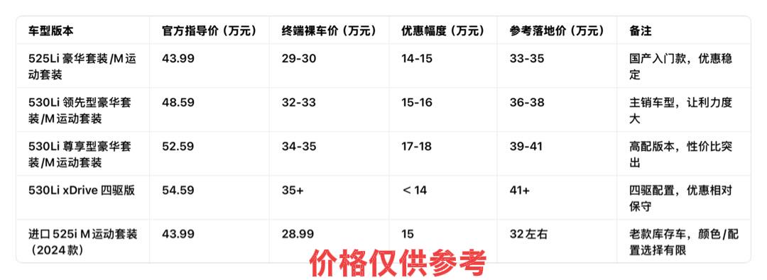 近期走访多家宝马4S店后发现,这款豪华中大型轿车的终端价格正呈现显著松动,不同配置、年份车型的优惠幅度差异明显,给消费者带来了更多选择空间。作为曾经中产家庭的豪华标杆,如今宝马5系的价格门槛已大幅降低,但其中的行情细节值得仔细琢磨。 ⬇️⬇️⬇️ 目前在售的宝马5系主要以2025款改款和2026款为主,入门级的525Li系列是价格下探的主力。官方指导价43.99万的525Li豪华套装与M运动套装,终端裸车价普遍降至30万左右,部分渠道甚至能做到29万上下,优惠幅度稳定在14-15万之间。算上购置税约2.7万、商业保险8000-9000元及上牌费,落地价基本控制在33-35万区间,这个价格已经接近主流合资B级车的高配水平。 ⬇️⬇️⬇️ 主销的530Li系列优惠力度更为可观,其中领先型豪华套装和M运动套装指导价48.59万,终端优惠后裸车价约32-33万,优惠幅度高达15-16万,落地价普遍在38万以内。高配的530Li尊享型指导价52.59万,优惠后裸车价约34-35万,落地价40万左右,相比指导价节省超过17万。不过四驱版本的530Li xDrive优惠相对保守,部分门店优惠后裸车价仍在35万以上,个别渠道甚至暂无现金优惠,这与车型产能和市场需求密切相关。 ⬇️⬇️⬇️ 进口版本的宝马5系同样有不小让利,2024款525i M运动套装指导价43.99万,优惠后裸车价低至28.99万,优惠幅度达15万,落地价约32万出头,性价比相当突出。但需注意的是,进口车型的优惠多集中在老款库存车,颜色和配置选择相对有限。 ⬇️⬇️⬇️ 优惠政策方面,多数门店推出了置换补贴和金融方案。全品牌置换至高可享1万元补贴,部分门店对宝马老车主置换还有额外优惠。金融方案以低首付和低利率为主,首付比例最低可至20%,分期最长可达60个月,不过这类方案往往需要绑定店内保险或装潢。值得一提的是,库存超过6个月的车型常有额外现金优惠,但需接受特定配置和颜色。 ⬇️⬇️⬇️ 从市场背景来看,这波价格松动主要源于市场竞争和新旧车型交替。全新一代宝马5系已上市,但新款暂无优惠且需强制购买装潢包,使得现款车型成为性价比之选。同时,新能源车型的冲击也让传统豪华燃油车不得不调整价格策略。 ⬇️⬇️⬇️ 对于消费者而言,当前确实是入手宝马5系的好时机,但需注意价格的区域差异,一线城市优惠普遍比三四线城市高2-3万。购车时建议多对比几家门店,明确各项费用构成,避免被附加消费拉高实际支出。如果对配置和颜色没有特殊要求,选择库存车型能获得更大让利;若追求新技术,可等待新款优惠松动,但短期内可能需要承担更高成本。 (内容仅供参考,具体详情请咨询当地经销商)【来自懂车帝车友圈】