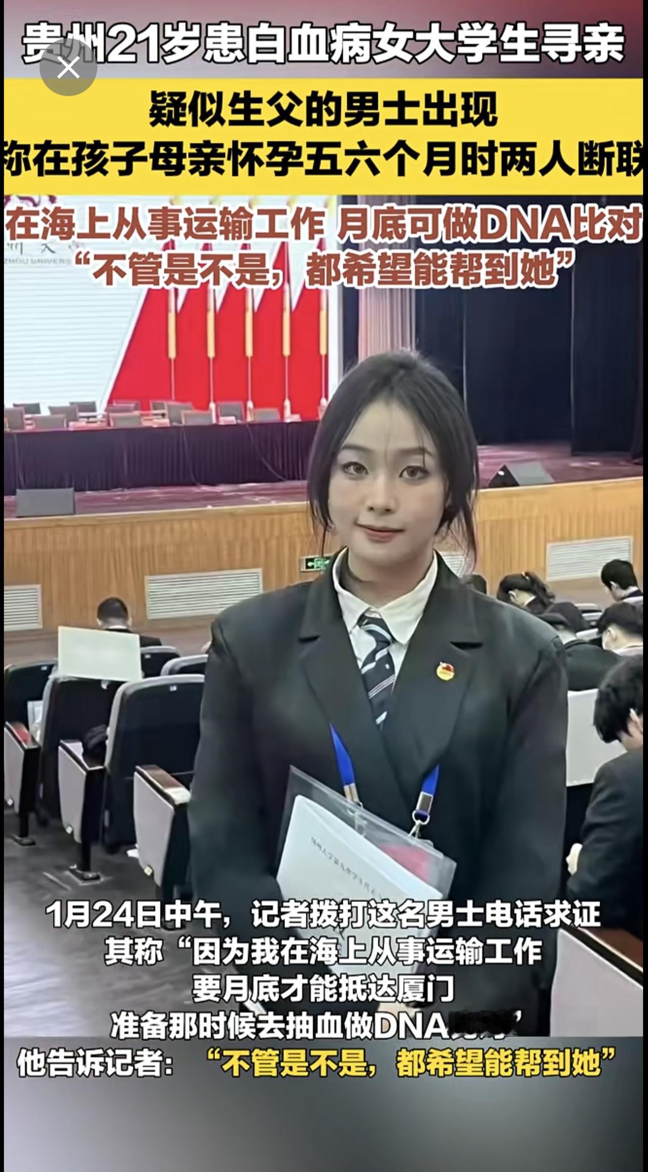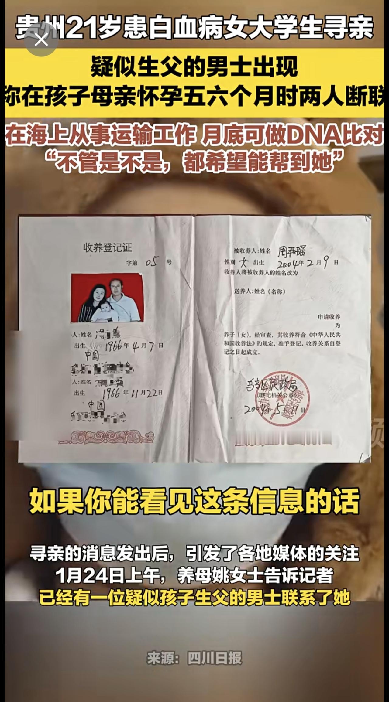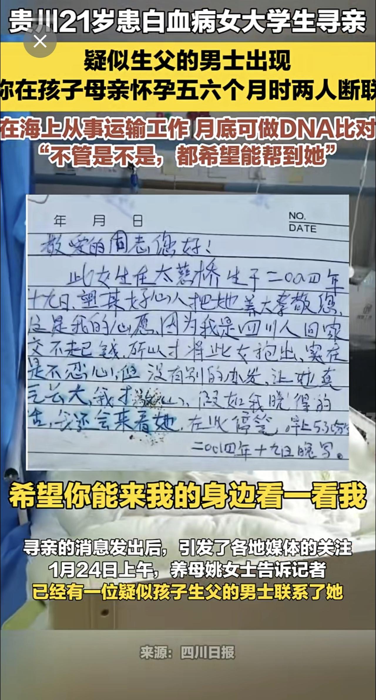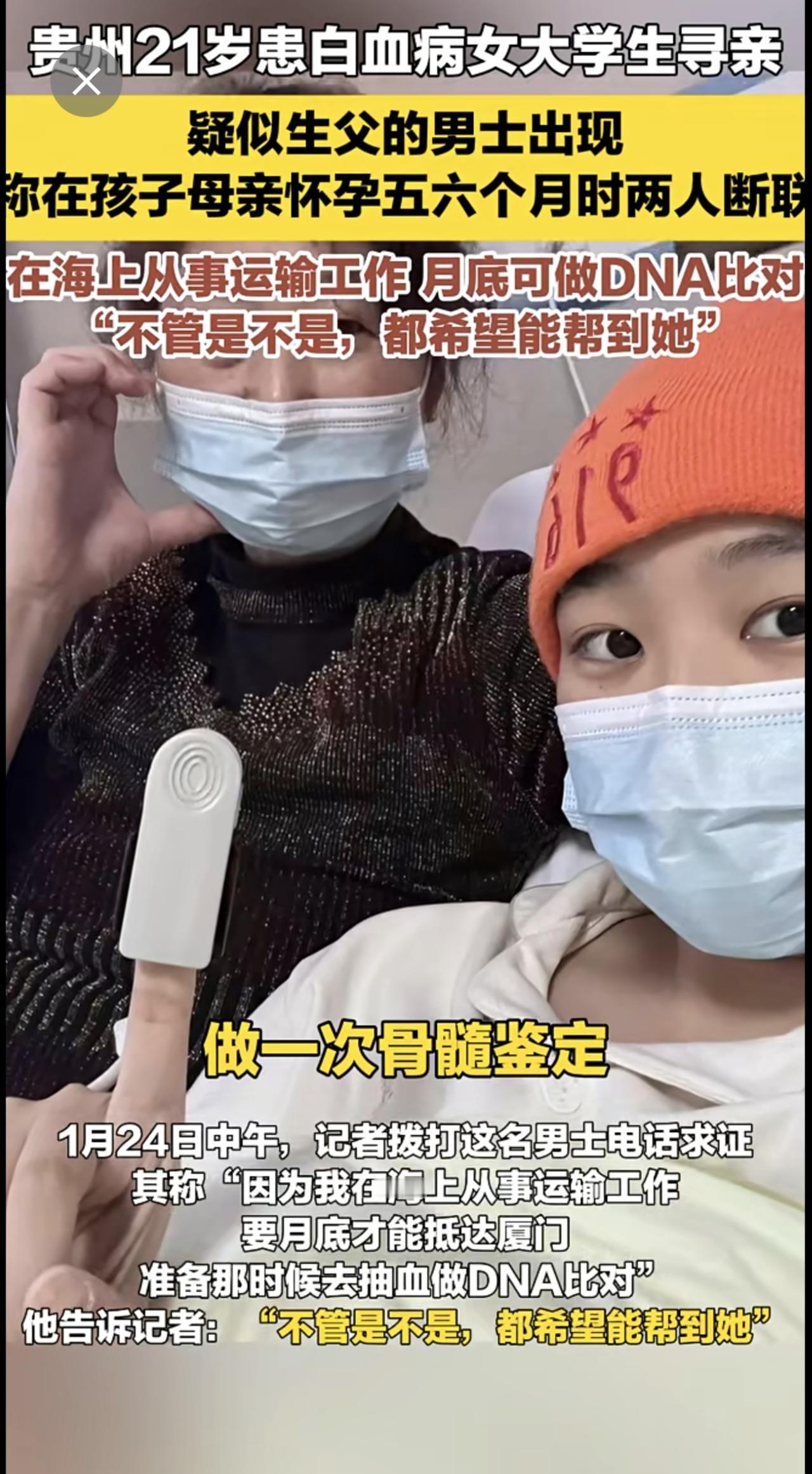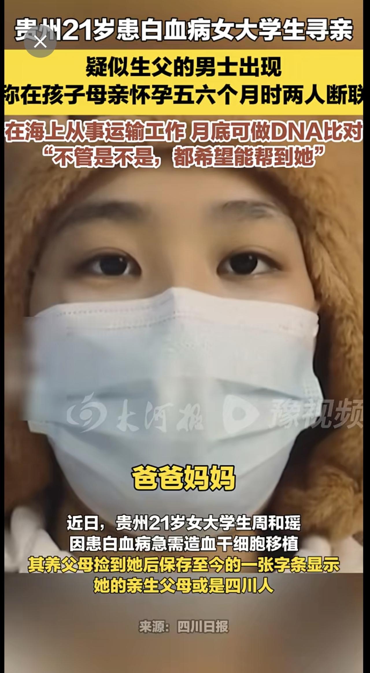 贵州21岁患白血病女大学生寻亲,疑似生父出现,在海上从事运输工作 月底可做DNA比对 寻亲 白血病 血癌 媒体精选计划 (豌豆)