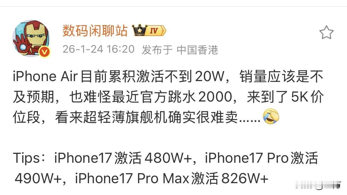 iPhone Air目前累积激活不到20W! 可能今天大家讨论最多的,就是苹果的这个轻薄手机,因为昨天他毫无预兆的咔咔的把价格降到了5000多的范围,作为行业的老司机数码博主拿出来背后的数据,这款网红的机器,现在的激活量不到20万[看] 要知道他的大哥数字系列,尾巴上的数字都远远大于这个激活量,所以这个时候他来了一个大跳水,苹果这样做其实直接受影响的就是我们国产同行,大家可能还有印象,前几天刚刚有同行刚刚发布了新的air手机,无论是外观颜色还是配置结构等等,方方面面都与苹果相似,尤其是在价格方面它有一定的优势,但是现在苹果的价格和这些手机的价格基本都差不多了[看] 所以现在国内同行还没有上市的企业,看到苹果的这波操作,估计有点蒙 ,但是还好苹果他这样做是定时定量的,只不过这样做了之后,不知道会不会后续会影响这个手机的销售,毕竟当大家习惯,同样的配置5000多块钱就能买到的时候,今后继续回到8000多,会不会影响销售还得打一个大大的问号[捂脸] 而且苹果的操作,不仅仅这款手机,17系列有好几款,都在搞活动,咔咔的降了1000多,看来大概都知道,马上就是春节了,还有部分潜在用户在观望,估计这个时候他们不行动都难了。