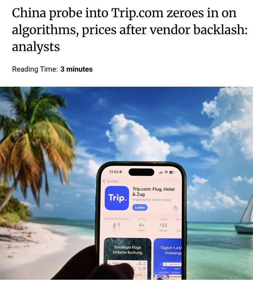 外媒:中国监管部门正在对全球最大的旅游平台之一携程(Trip.com)展开反垄断调查。此次调查主要聚焦于其定价算法和佣金问题,原因是该平台被指损害了中国庞大旅游市场中旅行者和旅游经营者的利益。 分析人士指出,如果一个平台不仅匹配买卖双方,还实际上决定了整个行业的运作方式,那么监管逻辑就会从纠正行为转变为防止市场治理被“私有化”。