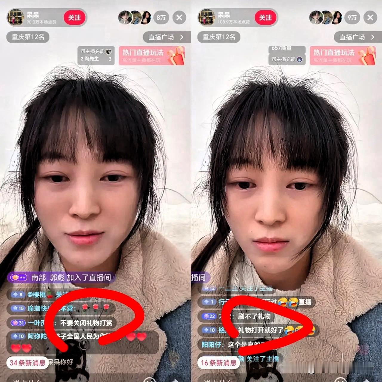 自从刨猪汤之后, 这是呆呆第一次开直播, 短短几分钟就9万人,都在让她打开 刷礼物功能,大家都想刷点小心意支持她,可呆呆直接给整懵了,就傻傻坐在镜头前反复说自己不会,旁边人耐心教她操作,她还是一头雾水,嘴里不停念叨要不重新开一下直播试试,那股手足无措的样子,真的又可爱又好笑。 网友急得抓心挠肝,想送礼送不出去,呆呆急得手足无措,学不会功能一脸无奈,这双向着急的画面,反而比那些精心策划的直播更让人上头。 其实现在网红圈太缺这种真实感了,人人都精通直播套路,个个都想着变现圈钱,唯独呆呆,火了之后依旧是那个啥也不会的笨样子,没有半点架子,不炒作不演戏,这份“呆劲儿”哪里是傻,分明就是最难得的纯粹。 正是这份不掺任何杂质的真实,才让大家心甘情愿为她停留,比起那些张口闭口都是套路的主播,这样的呆呆才更让人觉得亲切又靠谱。 你们觉得呆呆这份天然的呆劲儿,是不是她最圈粉的地方?
