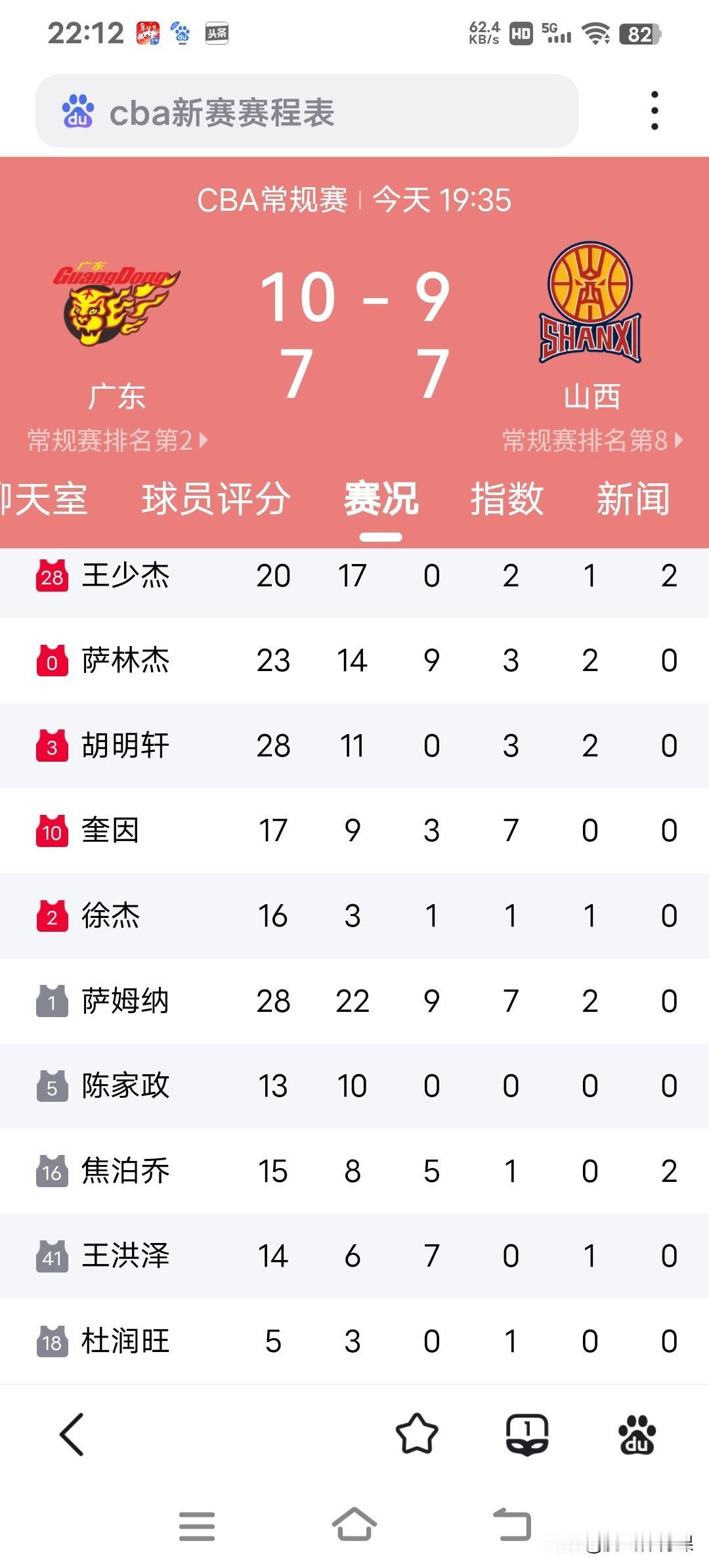 徐杰伤退,广东主场107:97艰难击败山西,给球队评分如下: 1.萨姆纳--9.5分,全场贡献22分9篮板7次助攻2次抢断,进攻火力十足。 2.陈家政--9.5分,全场贡献10分,防守作用非常大。 3.王少杰--9.0分,全场贡献17分1抢断2次盖帽,进攻效率非常高。 4.萨林杰--8.5分,全场贡献14分9篮板3次助攻2次抢断,可惜出现一次无味三分投篮犯规。 5.奎因--8.0分,全场贡献9分3篮板7次助攻,串联战术不错。 6.王洪泽--7.5分,全场贡献6分7篮板1次助攻,篮板保护不错。 7.胡明轩--7.5分,全场贡献11分3次助攻2次抢断,但是命中率不高。 8.徐杰--6.5分 全场仅贡献3分1篮板1次助攻1次抢断,第三节受伤离场,命中率仅5投1中。 9.李文昊--6.0分 全场贡献2分2篮板1次助攻,防守基本完成任务。 10.焦泊乔--6.0分 全场贡献8分5篮板1次助攻2次盖帽,中规中矩,自信心不足。 11.杜润旺--6.0分 全场贡献3分1次助攻。 12.张皓嘉--5.5分,全场2分1篮板,防守脚步太难了,针对性不强,容易犯规。