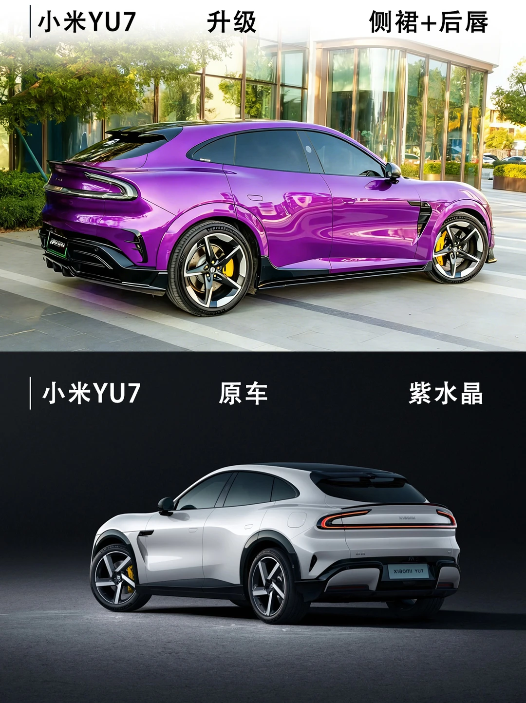 换了新的水晶紫高光膜,紫色控可以闭眼入,配上小米yu7的设计光泽感拉满了! AK套件含前唇、侧裙和后唇,弧度和原车完美匹配,安装也很简单
