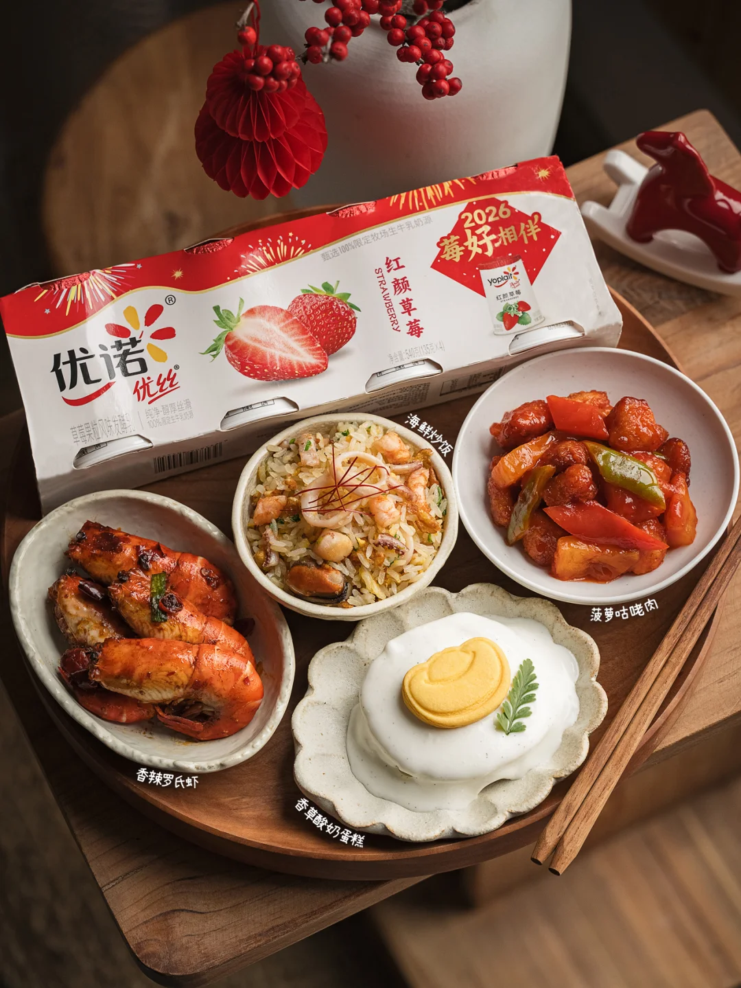 🍍菠萝咕咾肉|🦐香辣罗氏虾 🍚海鲜炒饭|🍰香草酸奶蛋糕 - 🍍菠萝咕咾肉 ❶五花肉块腌制后裹上蛋液和淀粉炸制 ❷与彩椒、番茄酸甜汁翻炒均匀 🦐香辣罗氏虾 ❶罗氏虾煎炸香,与蒜和辣椒煸炒 ❷调味后加水焖煮并收汁即可 🍚海鲜炒饭 ❶海鲜炒香备用,鸡蛋打散备用 ❷米饭加入蛋液炒干,与海鲜翻炒调味 🍰香草酸奶蛋糕 ❶蛋糕卷打底,淋上优诺优丝香草酸奶 ❷放上元宝曲奇和叶子点缀 - 新年与朋友小聚一餐别提有多快乐啦~ 除了满桌佳肴与欢声笑语相伴, 还有优诺优丝酸奶带来的味觉惊喜与满满仪式感。 全新的新年限定包装,红火又精致,每一杯都印着不同的祝福语,把“莓好相伴”“喜乐安康”的心意直接捧在手里,太适合新年聚会分享了! - 我尤其喜欢草莓和芭乐这两个口味—— 红颜草莓味里裹着大颗真实果肉,咬下去汁水盈盈,酸甜明亮,与醇厚绵密的酸奶交融在一起,口感饱满又生动。 红心芭乐味更惊喜,果粒清脆带沙,咀嚼时能感受到真实的果肉纤维,清爽的芭乐香缓缓渗入浓郁奶香中,解腻又轻盈。 香草口味也很绝,用的是马达加斯加香草荚,肉眼可见细密的香草籽。淋在小蛋糕上,瞬间多了份法式甜点的温柔与层次,香气自然又高级。 酸奶质地是真的扎实,11小时法式慢发酵让每一口都浓稠顺滑。 100%限定牧场生牛乳,配方干净简单,吃起来也安心。 - 新年聚餐,饭菜丰盛,尾声来一杯优诺优丝—— 不仅清爽解腻,更是一份传递美好的、带着祝福的甜蜜收尾🧨 -