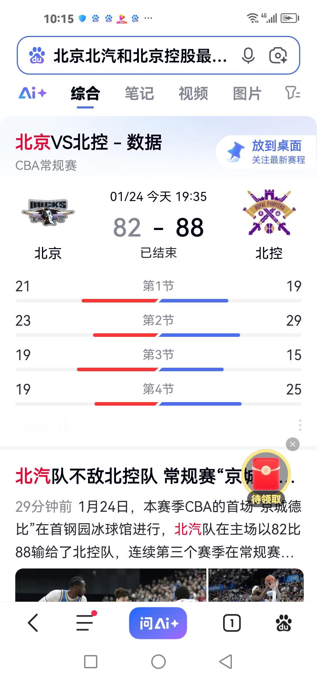 CBA常规赛第19轮:廖三宁联手邹雨晨北控险胜北汽结束连败 北京时间1月24日19:30分,CBA常规赛第19轮,北京北汽和北京北汽迎来了一场德比大战,北京北汽周琦缺阵,赵睿复出状态低迷。北京控股廖三宁联手邹雨晨,最终北控88:82战胜北京北汽,结束连败。 第一节,开局阶段北汽率先发力取得10:6的领先优势。北控连得4分双方战成10平、12平。此后北控反超比分领先,北汽把比分追到17平、19平。北汽压哨两分命中,第一节结束北汽21:19领先。 第二节,开局阶段北汽连得6分27:19领先。随后廖三宁连续得分把比分追到24:27,北汽杰曼两分打进。北控邹雨晨、里勒发力,北控32:31反超比分领先。关键时刻北汽陈盈俊3分命中,北控基兹林克还以颜色。邹雨晨和里勒分别打成2+1。北控一波17:3得分潮41:34领先。雷蒙两罚命中止血。双方战成42平。里勒3分命中,翟晓川两罚命中,第二节结束,北控48:44领先。 第三节,廖三宁连续得分,北控55:44领先两位数。北汽陈盈俊两分止血。邹雨晨连续得分,北控61:51领先北汽。此后北汽曾凡博站了出来。北汽一波10:0把比分追到61:61。北控基兹林克两罚命中止血。双方交替得分,比分咬的很紧。北控68:67领先。北控连得5分,73:67扩大领先优势。北汽3分打进。北控连续两分打进77:70领先。此后双方打的难解难分,北控82:72再次领先两位数。北控球员违体犯规,雷蒙连续4次罚球得分。把比分追到76:82。最终北控88:82险胜北汽。赢下北京德比大战,结束连败。 本场比赛,北京北汽杰曼得到17分,雷蒙得到15分,曾凡博得到20分;北京控股廖三宁和邹雨晨分别得到21分,里勒得到14分、佩里得到11分。廖三宁和邹雨晨的爆发是北京控股战胜北京北汽的主要原因。北京北控 北控CBA
