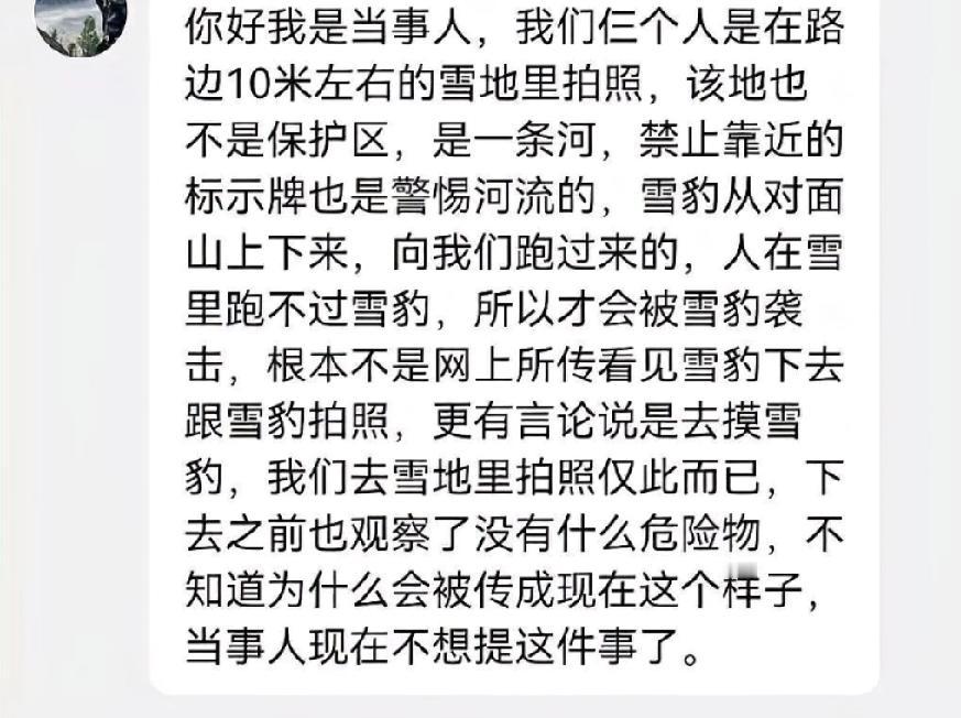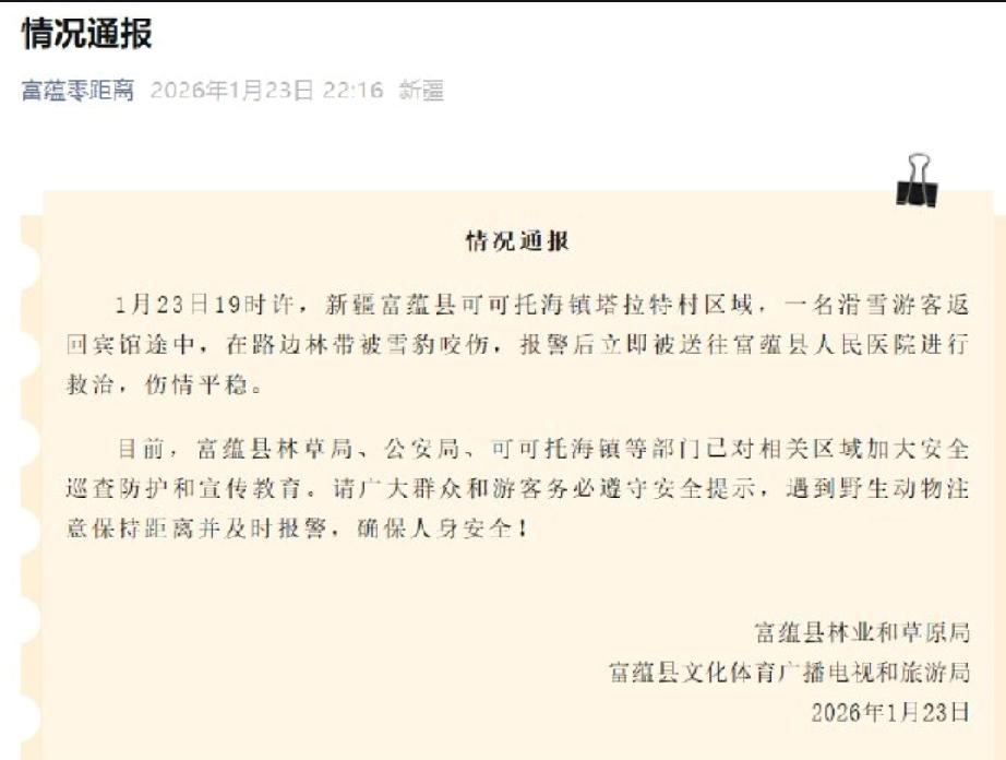新疆富蕴县发生一起雪豹伤人事件,伤者从急诊转至其他科室,引发广泛关注。 新疆富蕴县近日发生了一起雪豹伤人事件,一名滑雪游客在可可托海镇塔拉特村区域返回宾馆途中被雪豹咬伤,随后被紧急送往富蕴县人民医院救治。据富蕴县林业和草原局及文化体育广播电视和旅游局通报,伤者伤情平稳,已从急诊转入普通病房接受进一步观察和治疗。此次事件再次提醒人们,在野生动物出没区域活动时应提高警惕,保持安全距离,并及时报警以确保自身安全。富蕴县相关部门已加强对相关区域的安全巡查和宣传教育工作,呼吁广大游客和群众增强防范意识,共同维护安全环境。