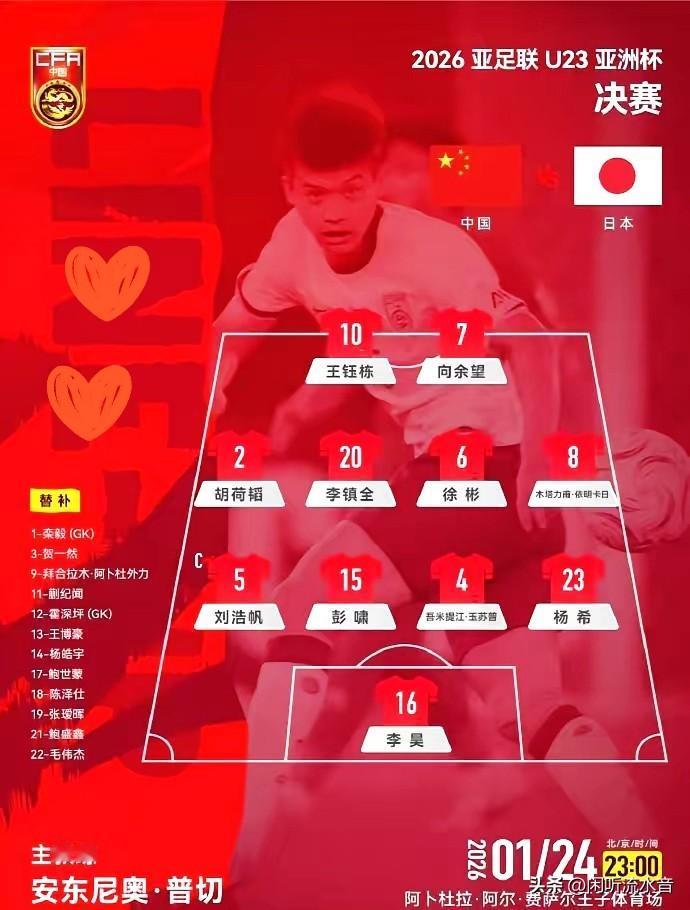 U23亚洲杯决赛时刻! 东方大国对阵日本首发阵容公布: - 门将: 16号 李昊(21岁 广东广州人) - 后卫(5人): 2号 胡荷韬、(22岁,重庆万州人) 5号 刘浩帆、(22岁,湖北武汉人) 15号 彭啸、(20岁,河南驻马店人) 4号 吾米提江、(21岁,新疆喀什人) 23号 杨希、(20岁,出生于西班牙巴塞罗那,中国籍球员) - 中场(3人): 20号 李镇全、(22岁,重庆人) 6号 徐彬、(21岁,湖南益阳人) 8号 木塔力甫、(21岁,新疆喀什人) - 前锋(2人): 10号 王钰栋、(19岁,浙江宁波人) 7号 向余望、(22岁,重庆人) 相比于半决赛对越南首发阵容变动4处,蒯继闻、王博豪、陈泽仕、鲍盛鑫替补出场,王钰栋、徐彬、木塔力甫、李镇全首发回归。 期待小伙子们的表现! 3个重庆崽儿U23国足决赛首发 U23国足决赛首发名单公布 各位网友,你们怎么看? 欢迎评论区留下你的见解! [免责申明]文章的时间、过程、图片全部来自于网络,文章或图片如有高度相似请及时联系我删除!