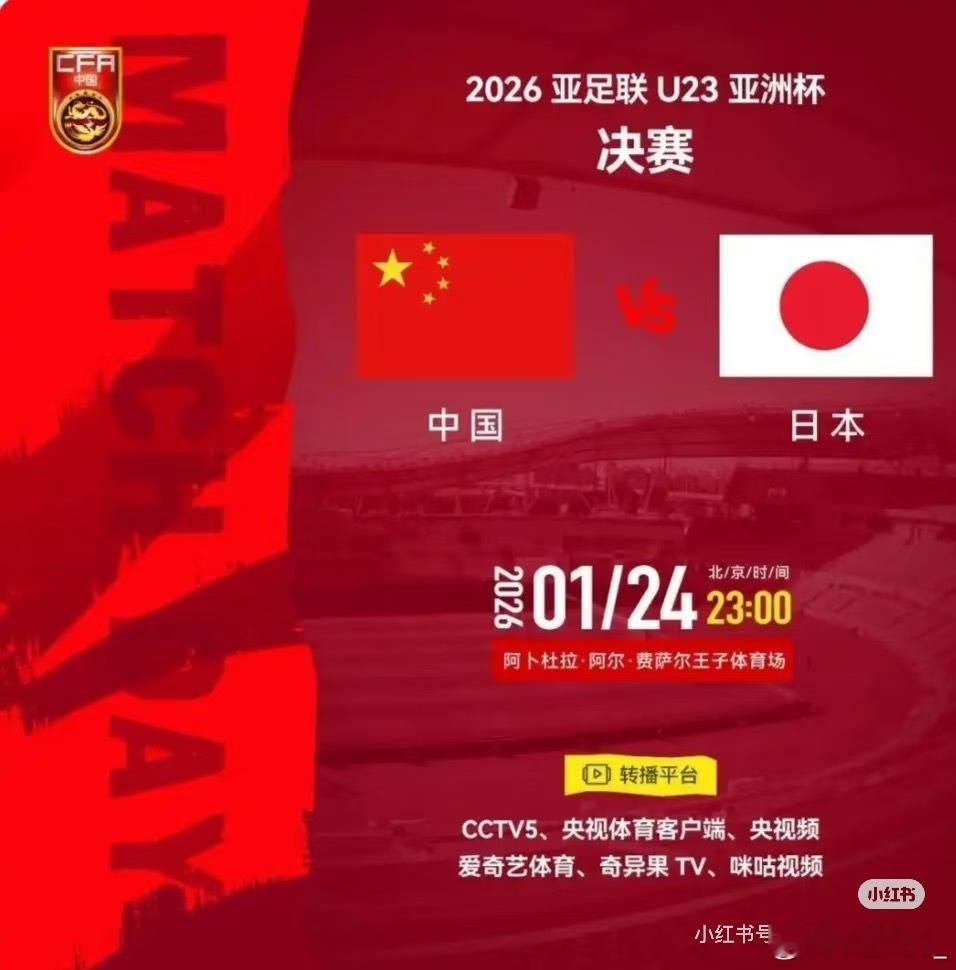 亚洲杯北京时间1月24日23:00,中国U-23国家男子足球队将与日本U-23国家男子足球队争夺本届赛事的冠军。让我们一起为中国U23男足加油!