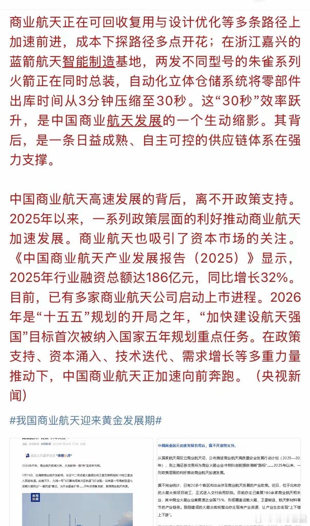下周商业航天势不可挡!央视新闻报道了商业航天未来发展计划和正在推进卫星发射工作。商业航天会得到更多政策和资金支持,加快技术迭代,让商业航天真正创造商业价值。由此看来,没有任何理由能阻止商业航天板块的热度,特别是在资本市场对商业航天板块炒作的狂热。因为其板块更具未来想象的发展前景和投资价值。当前市场正是挖掘潜力航天领域个股,今后我们的市场会出现10倍、100倍的成长个股。投资者请抓住时机进行挖掘上车,商业航天的投资将是你最为明智的选择!