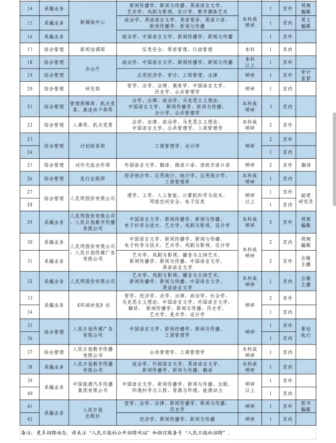 ✅太赶了,太赶了!人民日报社2026校园招聘终于来了,这次不是演习! 🎈本次招聘和去年接近,也是招聘64名工作人员,国内高校应届毕业生(含两年择业期),海外留学同学均可参与报名。 ✅相关专业比较多,文学类经济学类,法学类新闻传播学类,教育学类,历史学类、艺术学类均有相关的岗位。 🎈后续乐乐爸会给大家开招聘解析!同学们耐心等待一下!