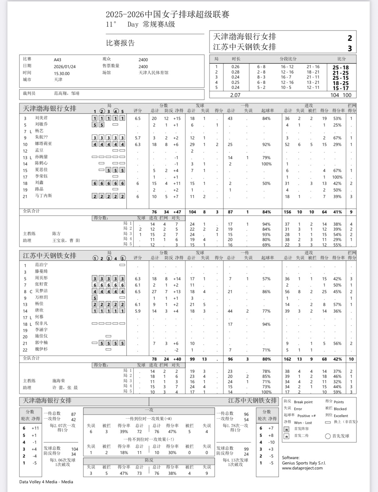 2025-2026中国女排超级联赛 女排联赛第十一轮:天津女排坐镇主场2-3不敌江苏女排(25-18,21-25,25-15,18-25,15-17),第一阶段主客场都是五局大战,最终遭遇江苏双杀刘美君20分(36扣19中2失误2被拦,1拦),娜塔莉亚18分(52扣15中6失误5被拦,1拦2发),刘鑫15分(31扣13中3被拦,2拦),马丁内斯10分(18扣7中1失误,3拦),夏思佳5分(6扣4中,1拦),朱航霆3分,刘敏乔2分,路晶2分,李荣钰1分。吴梦洁27分(56扣25中8失误2被拦,2拦),周页彤18分(36扣15中1失误1被拦,3拦),唐欣14分(39扣14中3失误2被拦),杨佳9分(14扣8中2被拦,1拦),郭中楠7分(9扣5中1被拦,2拦),张籽萱2分,万梓玥1分。扣球64-68,拦网9-10,发球1-3,自失22-28。