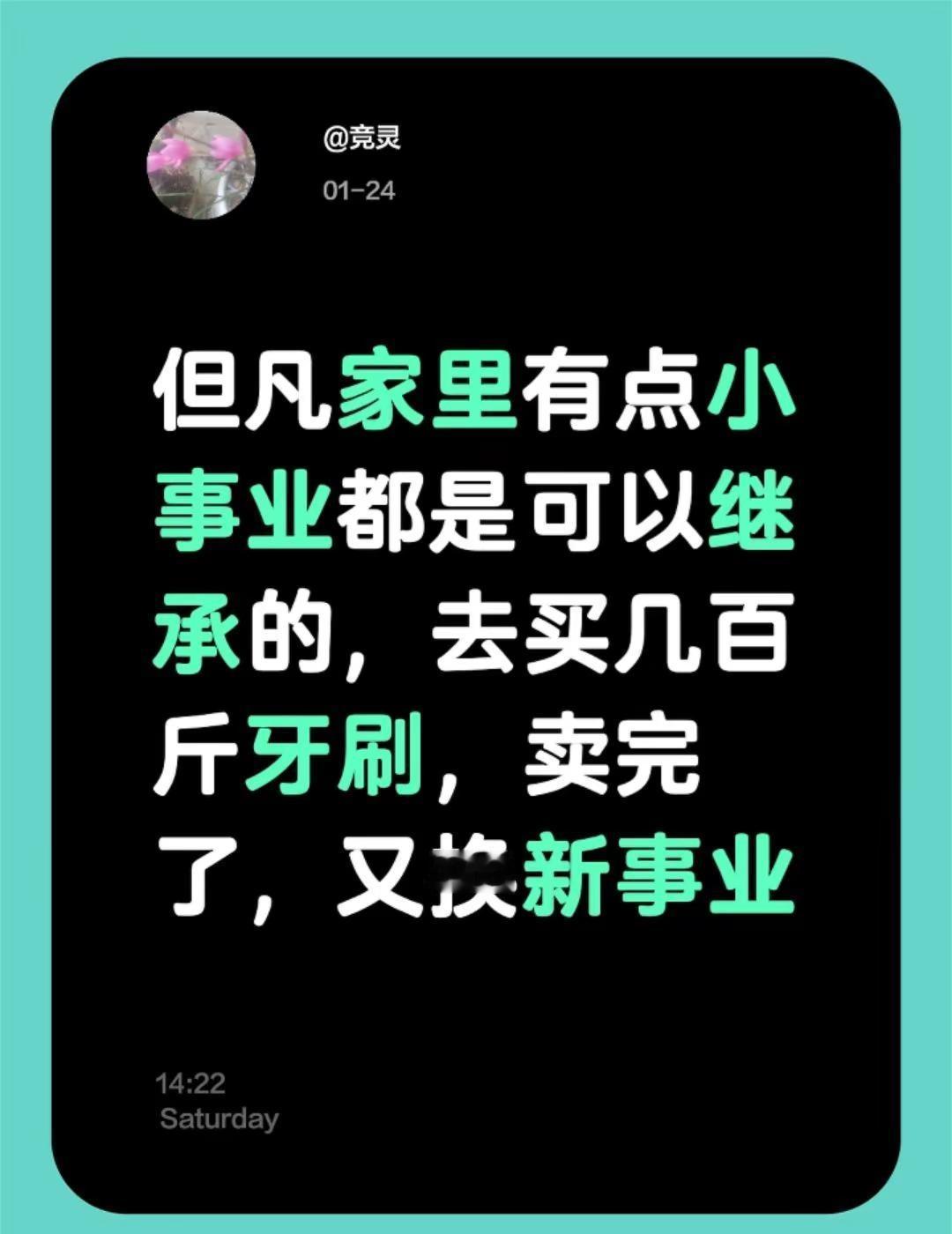 我评论了@竞灵的作品:但凡家里有点小事业都是可以继承的,去买几百斤牙刷,卖完了