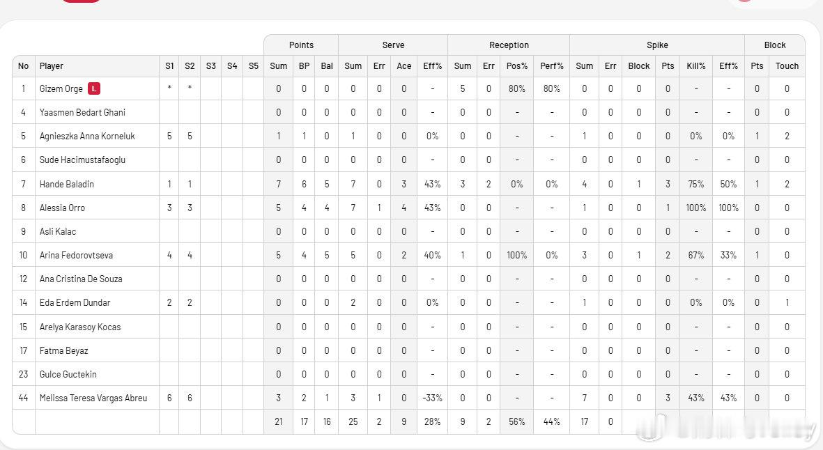 土超女排第18轮,费内巴切第一局暴走25-12扫飞埃扎克巴瑟(伊萨)。这一局发球就让对手崩溃,发球端9-2领先,其中奥罗4发,巴拉丁3发,费多罗夫采娃2发。女排 土耳其女排超级联赛