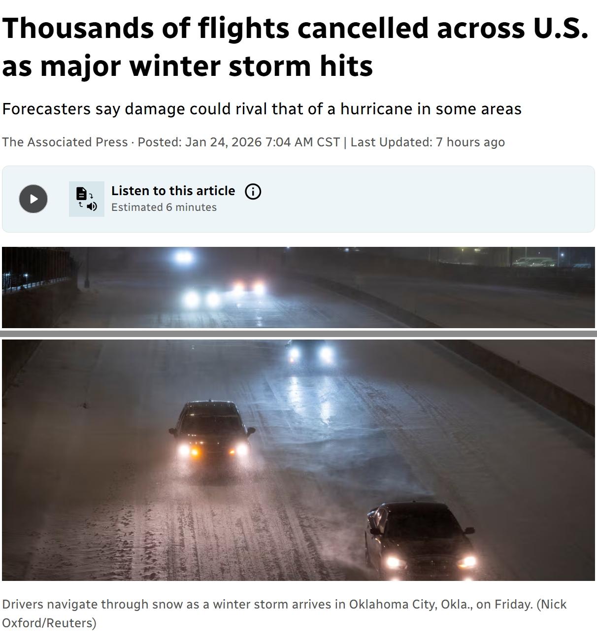 美国遭遇重大冬季风暴,造成大规模停电,上万航班取消, 由于一场预计将肆虐全美大部分地区的重大风暴正逼近,美国近1万个计划于周末起飞的航班已被取消,并威胁要停电数日,主要道路陷入瘫痪。预计大约有1.4亿人处于冬季风暴警告之下。 美国沃斯堡国家气象局表示,周六袭击德克萨斯北部的冰冻和冻雨正向该州中部移动。该机构在社交媒体平台X上表示:“危险的寒冷气温和风寒效应正在蔓延到该地区,并将持续到周一。” 周六上午,全美报告了超过95,000起停电,其中约36,000起在德克萨斯州,10,000起在弗吉尼亚州。根据美国人口普查局的数据,从德克萨斯到弗吉尼亚的至少11个南部州,大多数家庭通过电力供暖。五年前的一场严重寒潮摧毁了德克萨斯州大部分电网,导致数百万人连续数天停电,造成数百人死亡。 根据航班追踪网站FlightAware的数据,周六全美有超过3600个航班延误或取消,周日超过6200个航班被取消。 十多个州的州长们对即将到来的动荡天气发出警报,宣布紧急状态或敦促民众留在家中。 特朗普周五通过社交媒体表示,联邦政府正在与州和地方官员协调,“联邦紧急事务管理署(FEMA)已完全准备好应对”。 联邦政府已派遣近30支搜救队待命。联邦紧急事务管理署(FEMA)称,官员们在风暴预计穿越的区域布置了超过700万份餐食、60万条毯子和300台发电机。