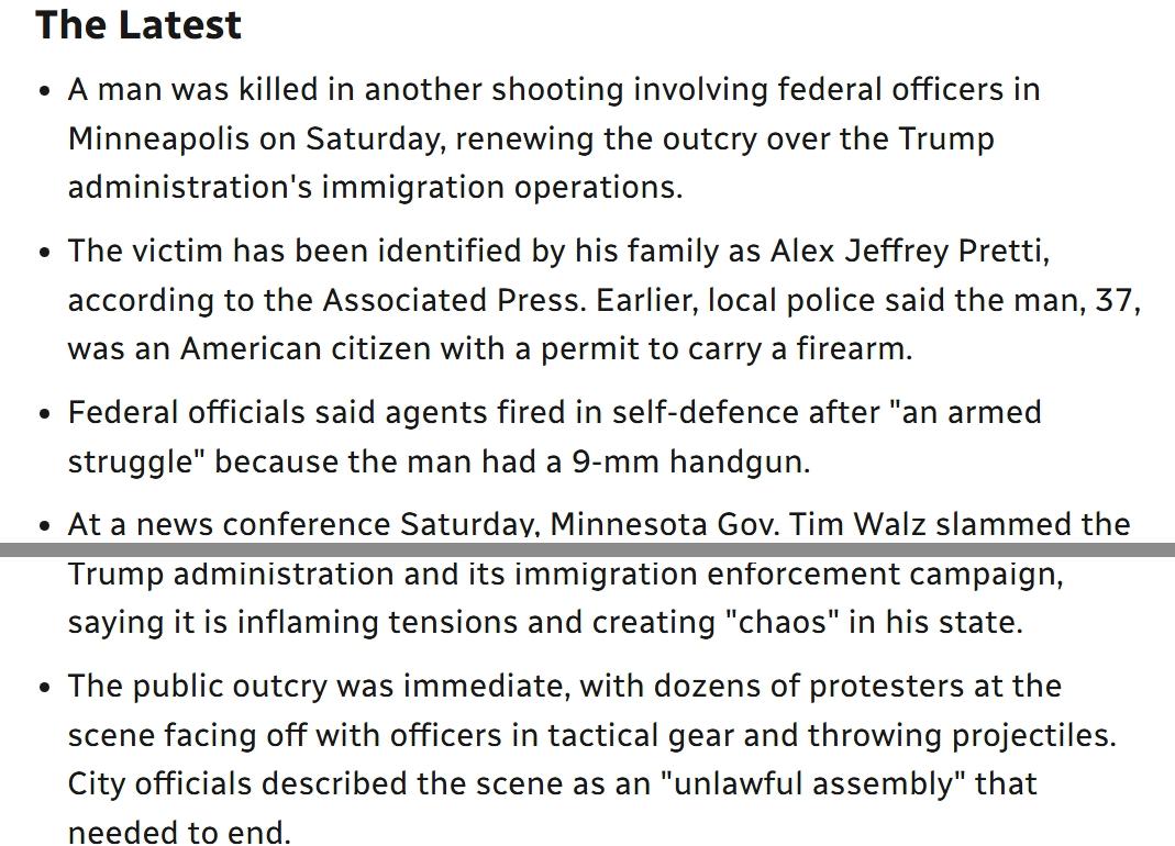 美国ICE特工再次枪杀一名美国公民 当地时间周六,明尼阿波利斯再次发生一起涉及联邦官员的枪击事件中,一名男子被击毙,这再次引发了对特朗普政府移民行动的强烈抗议。 据美联社报道,受害者的家人确认其身份为亚历克斯·杰弗里·普雷蒂。当地警方此前表示,这名37岁的男子是持有携带枪支许可证的美国公民。 联邦官员称,特工开枪是因为该男子持有9毫米手枪。 在周六的新闻发布会上,明尼苏达州州长蒂姆·沃尔兹猛烈抨击特朗普政府及其移民执法运动,称这激化了紧张局势,并在他的州制造了“混乱”。 公众立刻引发了强烈抗议,数十名抗议者在现场与身穿战术装备的警员对峙,投掷投掷物资。市政府官员将现场描述为“非法集会”,必须结束。 这起枪击事件发生在几周前,一名移民与海关执法局(ICE)官员在同一城市枪杀了蕾妮·古德,引发了全美范围内的广泛抗议。