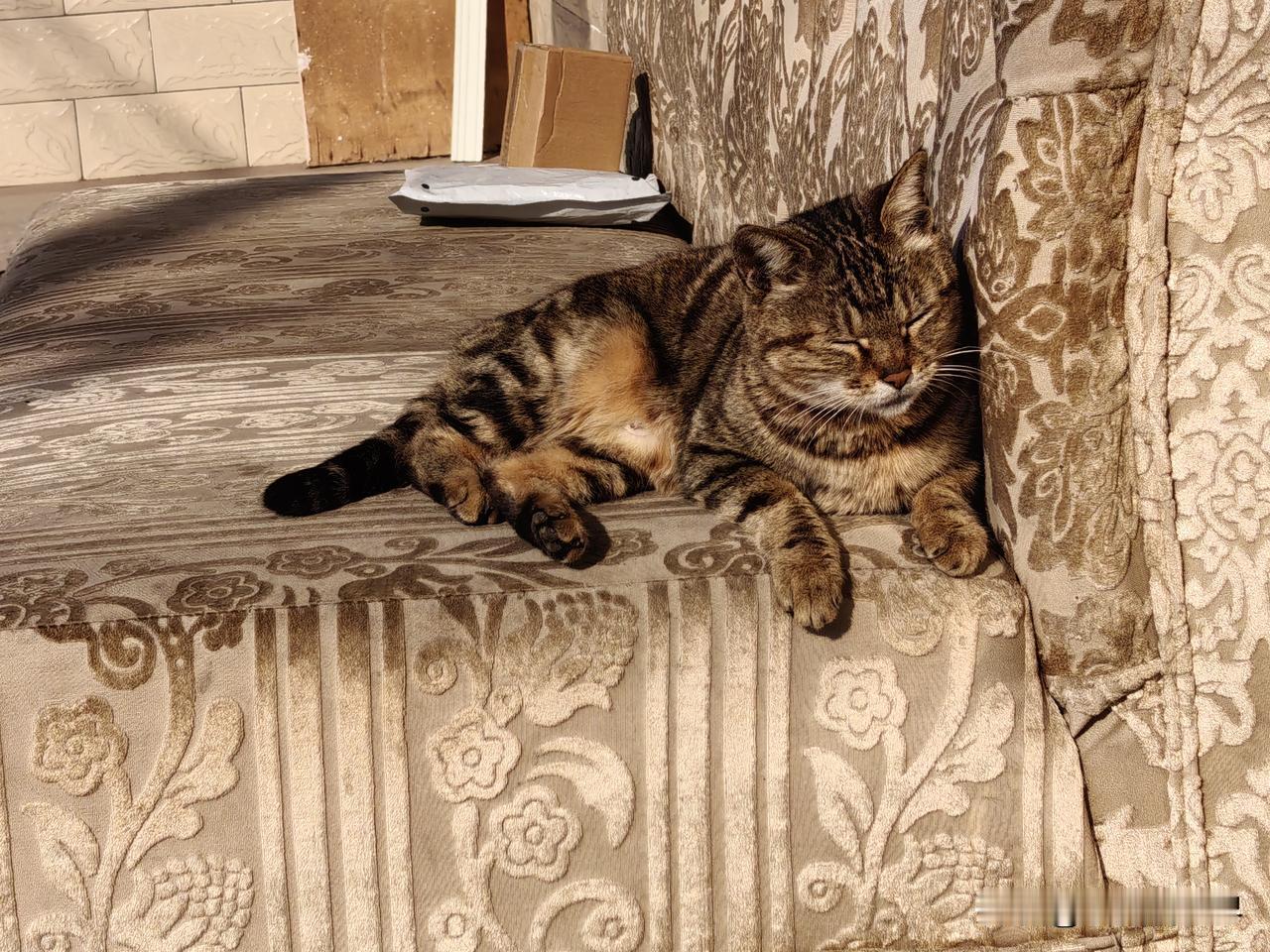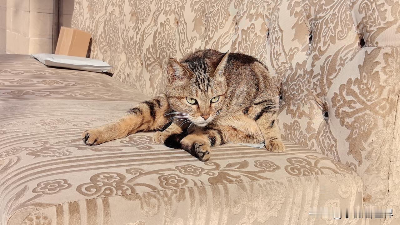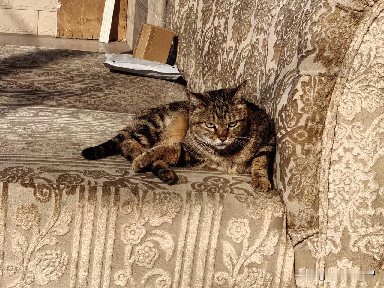 才到娘家,就看到我老妈养的这只猫咪躺在门口沙发上晒太阳,看到我拍它,还发出凶巴巴的光。 这也是一只流浪猫,来到我家就不走了,但它成功挤走了另一只流浪猫,因为它比较凶悍,有吃的总抢在前面。 和其他猫爱吃鱼不同,它喜欢吃肉,没肉其他东西也吃。 它每天跟着我老妈身边,老妈去地里,它也跟着去,蹲在旁边不声不响玩。它的所作所为不像猫,倒像是一条忠诚的狗。 最搞笑上次回家,因为老妈生病住街上我家里五天了,我们到家吃完饭不久,刚到房间准备休息。 它不知从那里窜了出来,蹲在窗口喵呜喵呜叫,老妈说它大概饿坏了,来要吃的了。 我赶紧出去,它刺溜一下就跟上来了,好像得到指令一样,等到把肉拿出来,它马上就狼吞虎咽吃起来。 平时它爱四处串门,且说前几天,老妈突然告诉我们,说看到这只猫抓到一只老鼠。 哈哈,我们还一直以为它只是个吃白食的猫,想不到它还能为民除害。