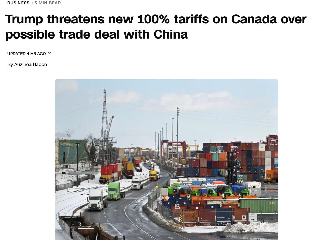 彻底决裂:特朗普威胁要对加拿大征收新的100%关税 当地时间周六,特朗普威胁称如果加拿大与中国达成贸易协议,将对加拿大进口商品征收100%关税。 特朗普嘲讽地称卡尼为“州长”,在社交媒体发帖:“如果卡尼州长认为他要把加拿大作为中国向美国运送货物和产品的'卸货港',那他就大错特错了。” 这与特朗普之前的言论形成了鲜明对比,他在1月16日曾表示:“对(卡尼)来说,签署贸易协议是件好事。如果你能和中国达成协议,他应该这么做。” 特朗普与卡尼最近一直有言语上的交锋,卡尼在瑞士达沃斯世界经济论坛的演讲中将美国描述为全球性的“断裂”而非过渡,并说“中等大国必须共同行动,因为如果我们不在谈判桌上,我们就是美国的菜单。“ 随后特朗普在Truth Social上对卡尼喊话:“加拿大的存在是因为美国,记住这一点,马克,下次你发言时。” 卡尼回应说:“加拿大的存在不是因为美国。加拿大之所以繁荣,是因为我们是加拿大人。”