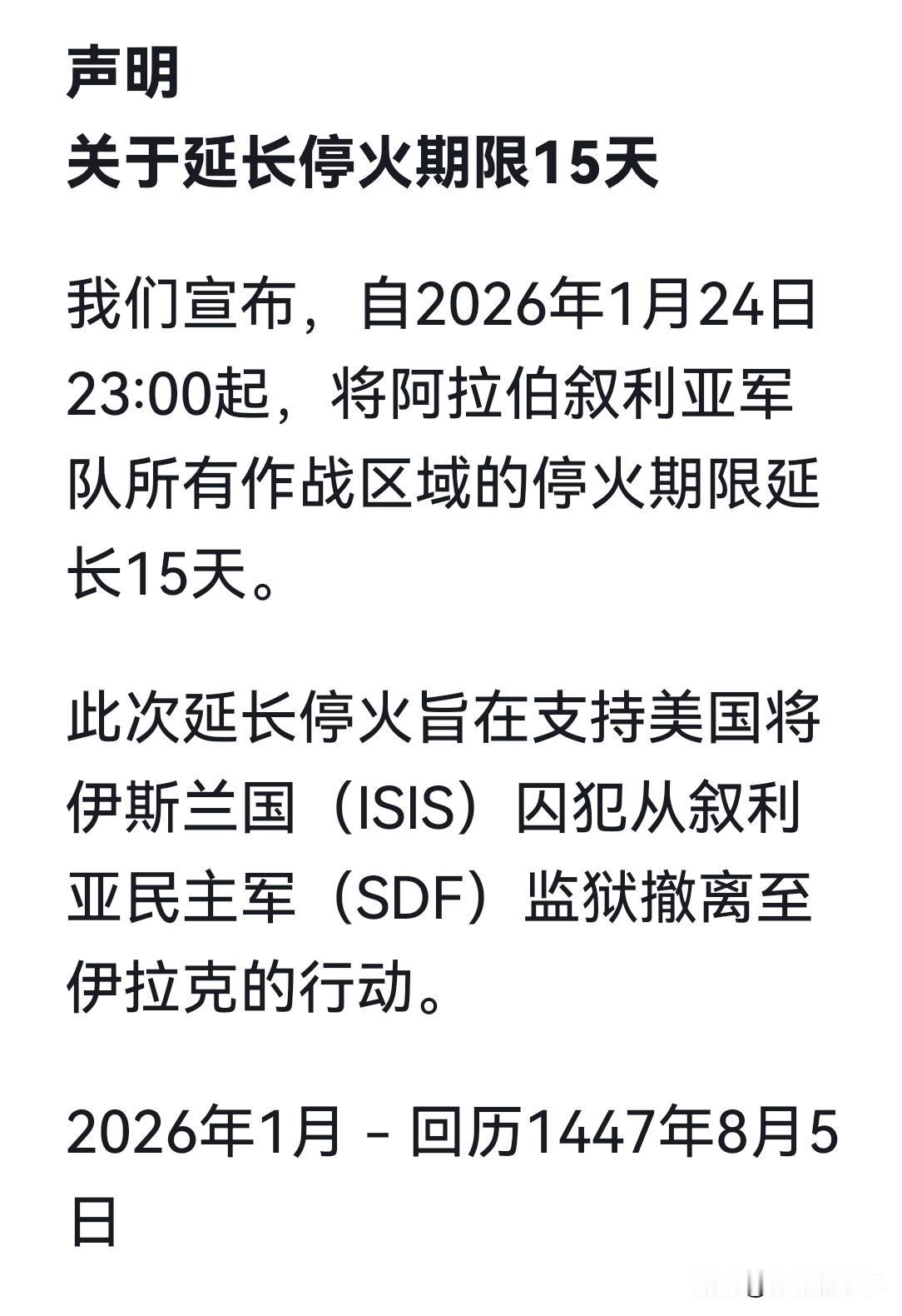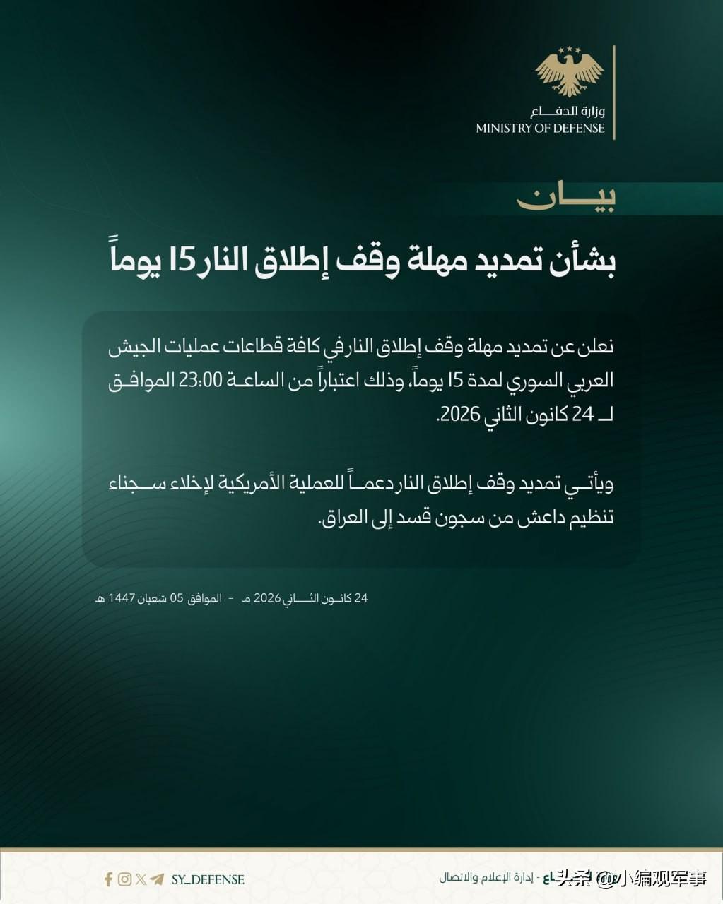 在持续四天的停火结束后,叙利亚过渡政府的国防部宣布从1月24日23点起将停火期限延长15天,以便美军将被关押的IS成员从“叙利亚民主军”控制的监狱转移至伊拉克。 尽管延长了停火期限,但敌对行动并未停止,叙利亚过渡政府军与“叙利亚民主军”在前线仍有零星交火。此外,双方在前线后方都对囚犯和平民犯下了战争罪行(如实施屠杀)。