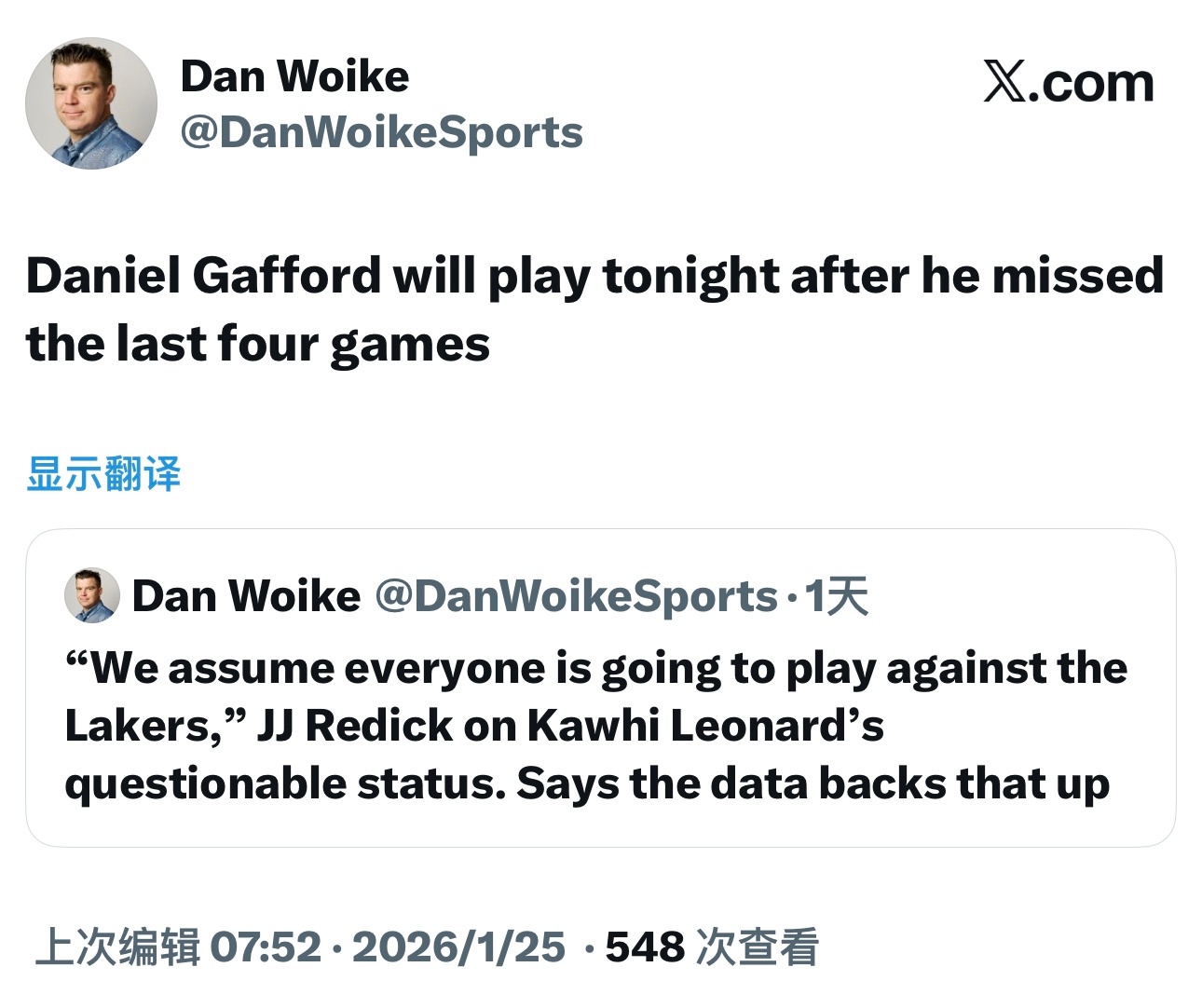 缺席了此前四场比赛得独行侠中锋加福德今天复出打湖人。