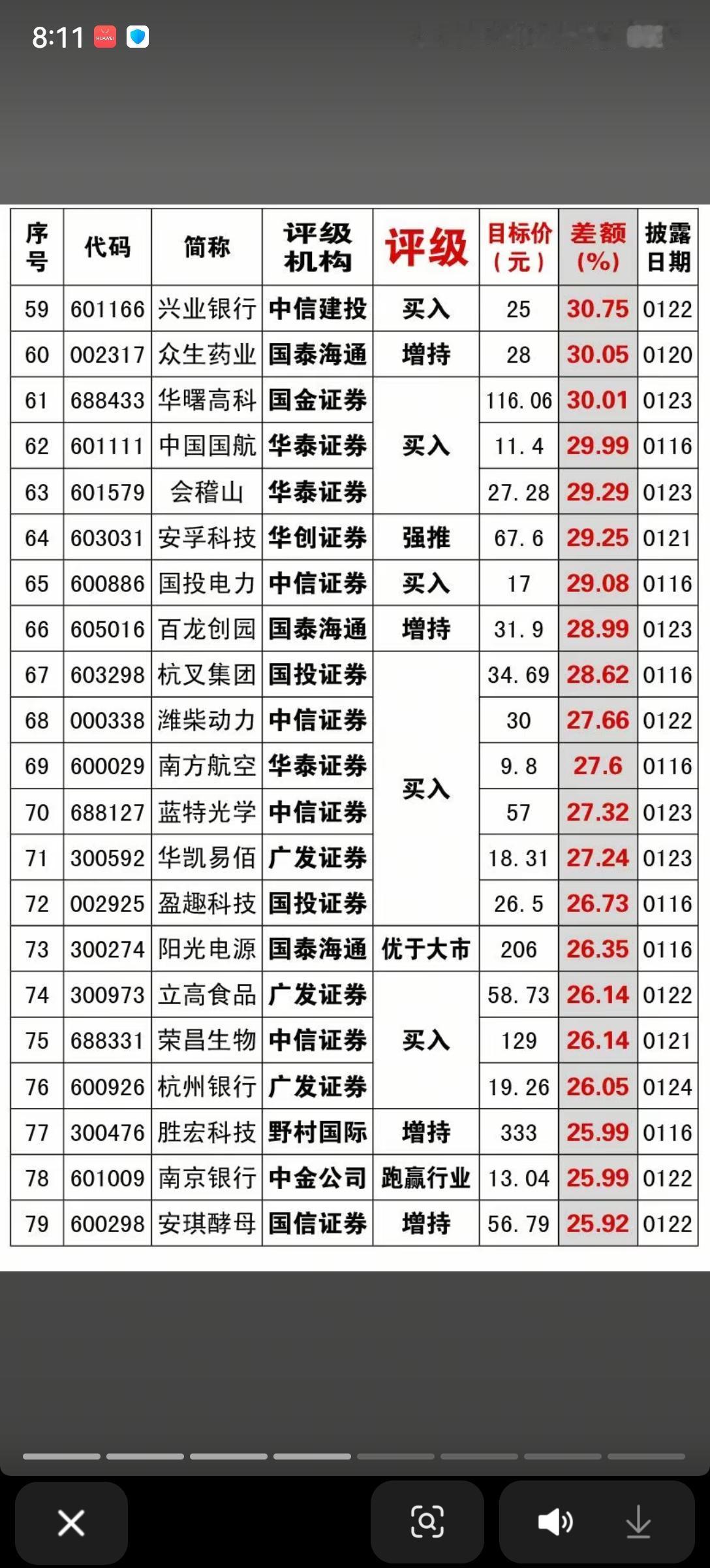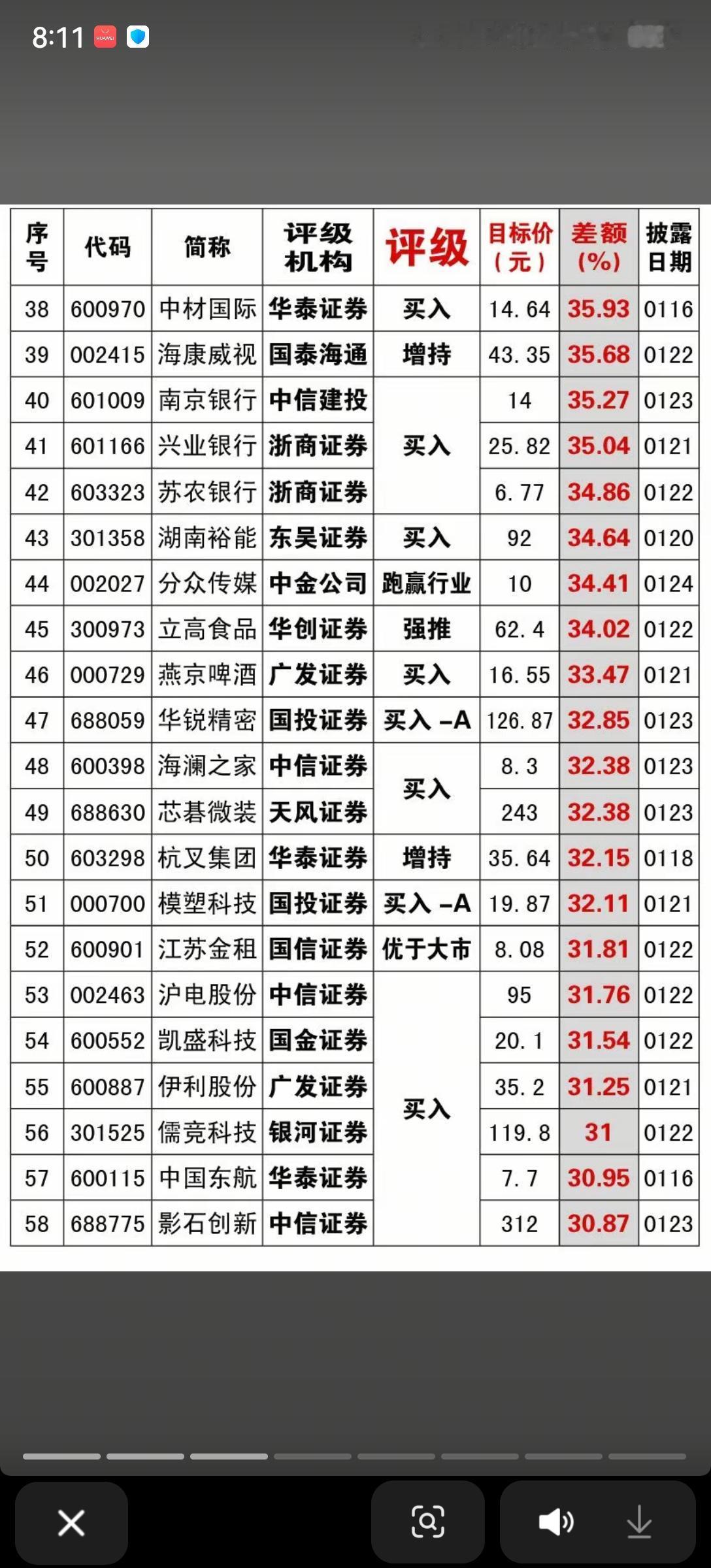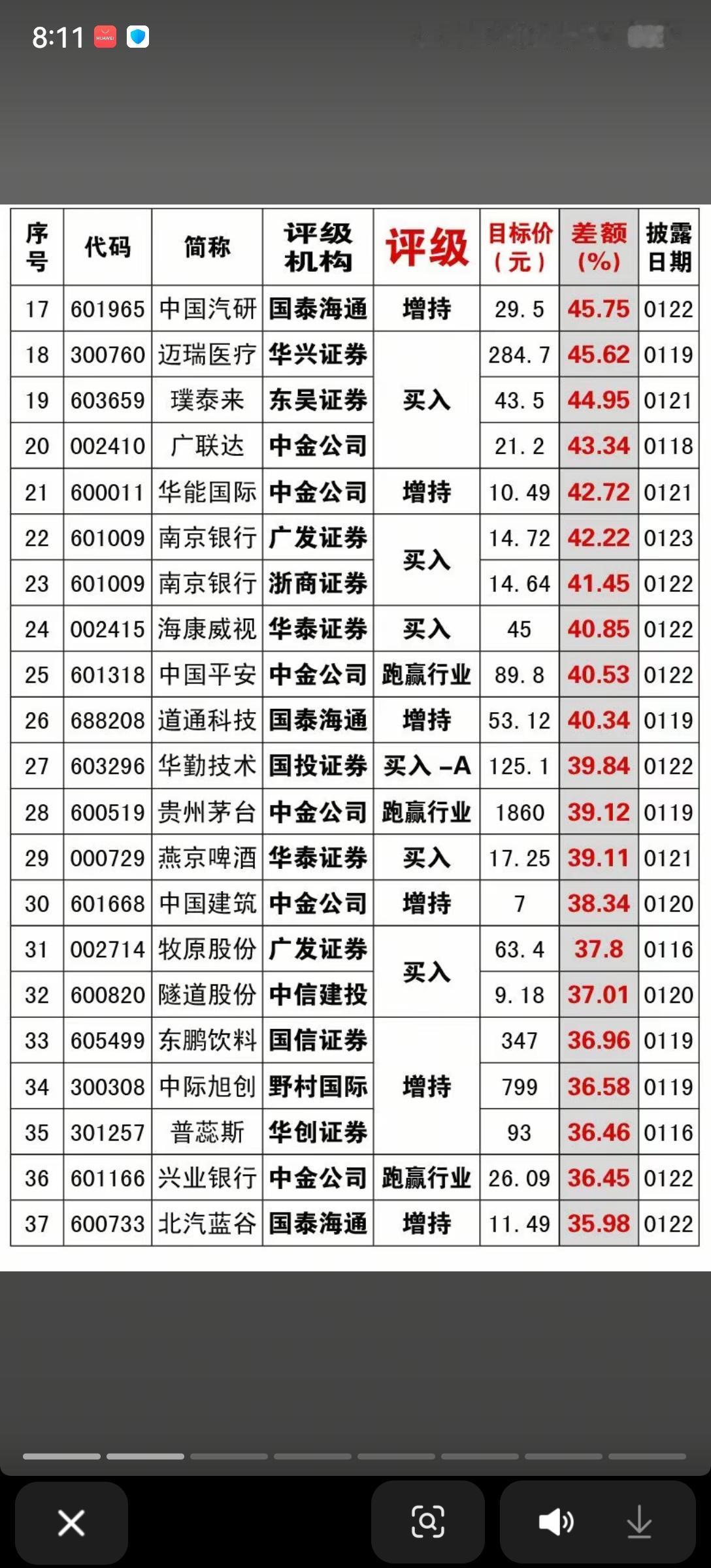 1月25日,本周A股机构评级、目标价一览表!!!