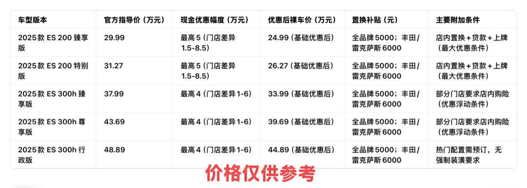 朋友想买一辆25款的雷克萨斯,于是便约上我一起去雷克萨斯4S店逛了一圈,主要想摸清2025款ES的真实价格和优惠情况,毕竟网上报价五花八门,不如到店问得实在。刚进店就说明来意,销售没有过多推销车型配置,直接拿出了最新的报价单,这点让人觉得挺省心。 先看官方指导价,2025款ES的价格区间很清晰。入门的200臻享版定价29.99万,比它高一个配置的200特别版是31.27万,两者差价1.28万。混动系列的300h臻享版要37.99万,尊享版43.69万,顶配的行政版则到了48.89万,混动车型之间的价格梯度比燃油版更明显。销售解释说,这个定价和去年款相比基本没变化,属于品牌一贯的稳定定价策略。 实际优惠方面,不同经销商的政策差异不小。这家店给出的现金优惠是燃油版最高5万,200臻享版优惠后裸车价24.99万,特别版26.27万;混动版优惠稍低,最高4万左右,300h臻享版优惠后33.99万。但销售强调,想要拿到这个优惠,需要满足店内置换、店内贷款和店内上牌三个条件,要是只选其中一项,优惠会缩水不少。后来我又电话咨询了另外两家店,一家给出的燃油版优惠6.5万,没有强制贷款要求,但必须在店内购买保险;还有一家优惠力度最大,燃油版直降8.5万,不过要求本月内订车提车,且必须是报废置换,限制条件更多。 置换补贴是优惠里的重要部分,不同身份的车主能拿到的补贴不一样。全品牌置换普遍能享5000元补贴,要是之前开的是雷克萨斯或丰田车型,置换补贴能提到6000元,增购的话也有2000元支持。另外,医护人员和教师这类特定职业,还能额外拿到3000元补贴,销售说这部分补贴是厂家直接发放的,和店内优惠不冲突。 金融政策方面,目前主要有两种选择,要么是低利率贷款,要么是0首付方案,没有明显的贴息力度特别大的政策。值得一提的是,这家店没有强制要求购买装潢,像贴膜、脚垫这些都是自愿选择,这和我了解到的有些门店不一样,有的经销商会把装潢和优惠绑定,不买就不给最大折扣。 提车周期也和价格相关,现车充足的主要是200系列的两款车型,基本付款后一周内就能提车;混动版部分颜色需要预订,周期大概1-2个月,要是选装特殊配置,等待时间可能会到3个月以上。销售说现在订车不用加价,这和前两年部分热门配置需要排队加价的情况比,已经宽松了不少。 整体来看,雷克萨斯ES的价格体系比较透明,官方指导价稳定,但实际成交价受置换条件、购车方式、提车时间等多种因素影响。消费者在购车时不能只看表面优惠幅度,还要算清楚附加条件带来的额外成本,比如贷款利息、保险费用等。对于追求稳定、不急于提车的消费者,选择限制条件少的优惠方案更划算;而那些刚好要置换旧车、又有贷款需求的消费者,就能享受到最大幅度的优惠,总体还是要根据自身情况来权衡。 (内容仅供参考,具体详情请咨询当地经销商)【来自懂车帝车友圈】
