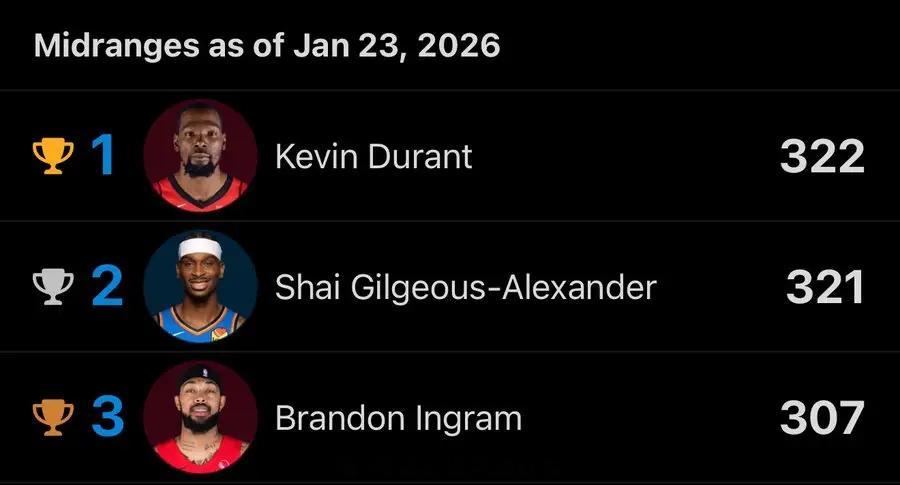 本赛季中距离投篮命中榜:杜兰特亚历山大英格拉姆前三杜兰特休斯顿火箭新赛季篮不住