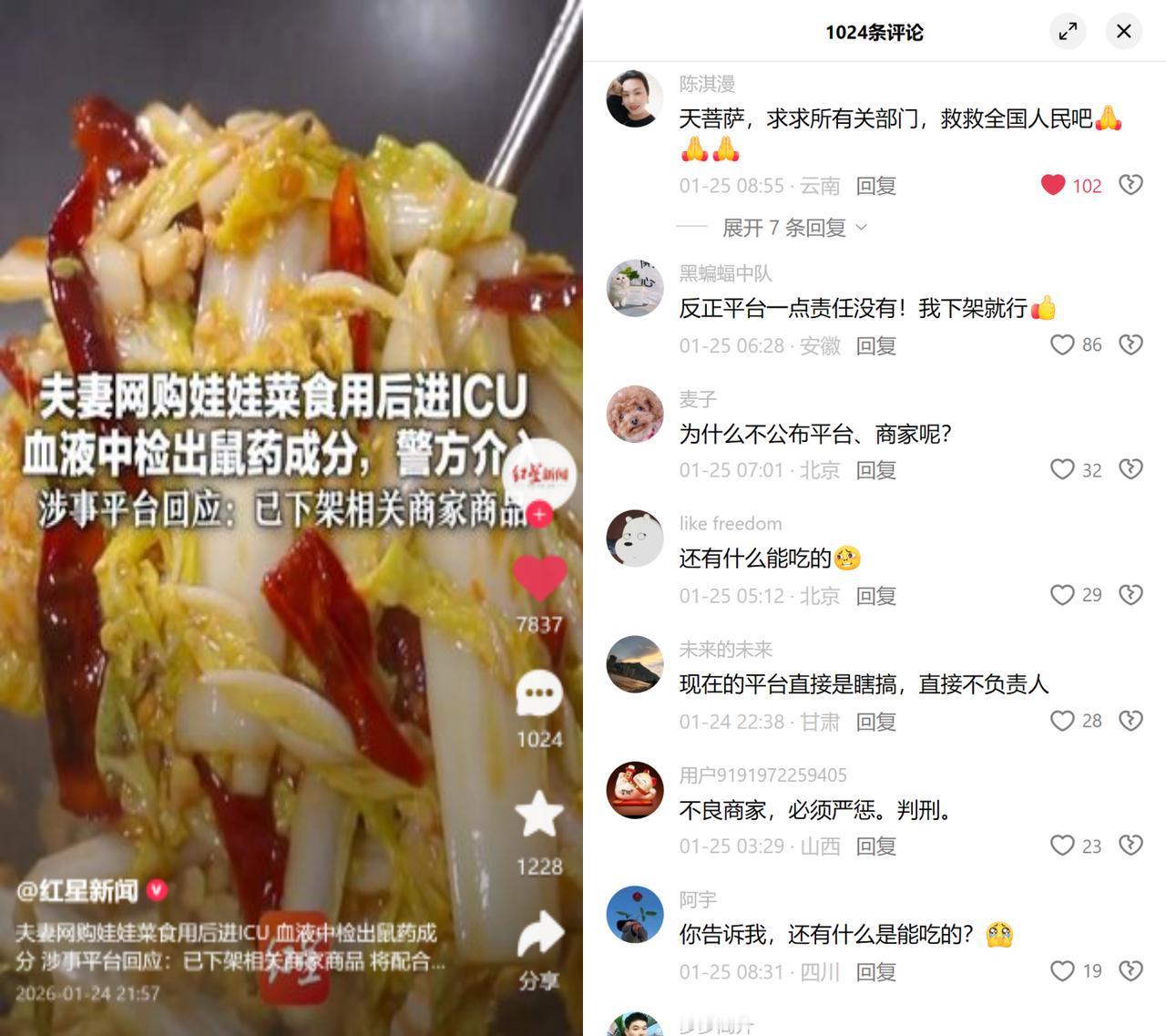 浙江一对夫妻吃了网购的娃娃菜,直接进了ICU,血液里检出鼠药,妻子在重症监护室躺了一个多月才好转。 等找商家要说法,对方否认;平台回应就俩动作:下架涉事商品,配合帽子叔叔调查。 这事儿最扎心的,比起菜里有毒,更是平台那套事后补丁逻辑,火灭了才提灭火器,补完就说我处理了。留言里大家追着问还有什么能吃的,但这不仅仅是问能吃啥,更想知道谁能帮我把住入口的第一道关?平台要的是尽快平息风波,可咱们老百姓要的,是买个菜不用先猜有没有毒的踏实。 现在帽子叔叔还在查,夫妻还在养身体。可更让人慌的是,下一次,会不会是你我手里的那颗青菜?