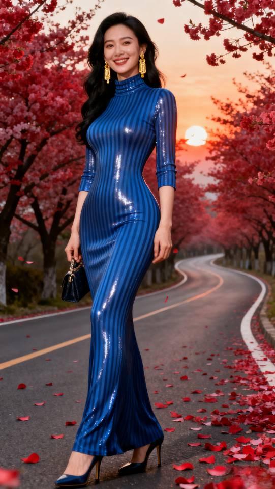 夕阳下,身穿蓝色长裙的女子在公路上漫步,与落花相映成趣。连衣裙美女壁纸