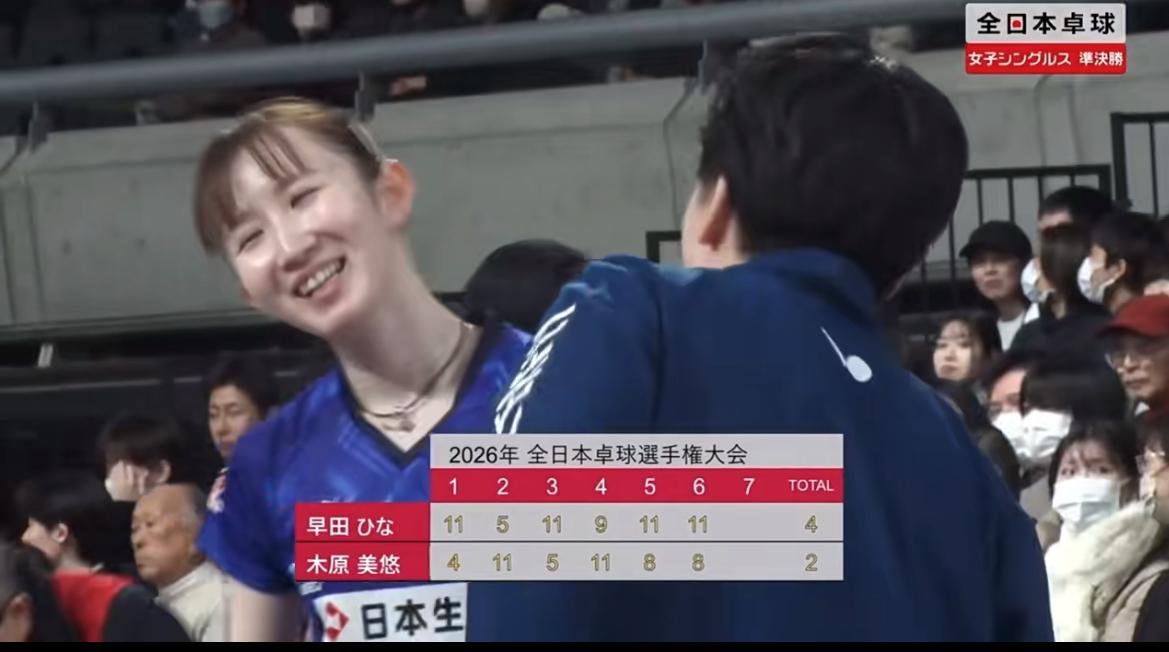 早田希娜4:2木原美悠晋级全日锦决赛——早田笑容灿烂离冠军只差一步 1月25日,全日锦女单半决赛中 早田希娜4:2木原美悠,晋级决赛! 11:4,5:11,11:5,9:11,11:8, 11:8 早田希娜晋级决赛后, 笑容灿烂! 女单另一组半决赛是 张本美和VS横井咲樱, 估计女单决赛还会在 张本美和与早田希娜之间进行! 早田赛后的采访中表示, 打进决赛,离目标越来越近, 我最大的目标就是卫冕全日锦冠军, 我相信自己一定可以做到, 谢谢大家继续支持我, 为我加油!