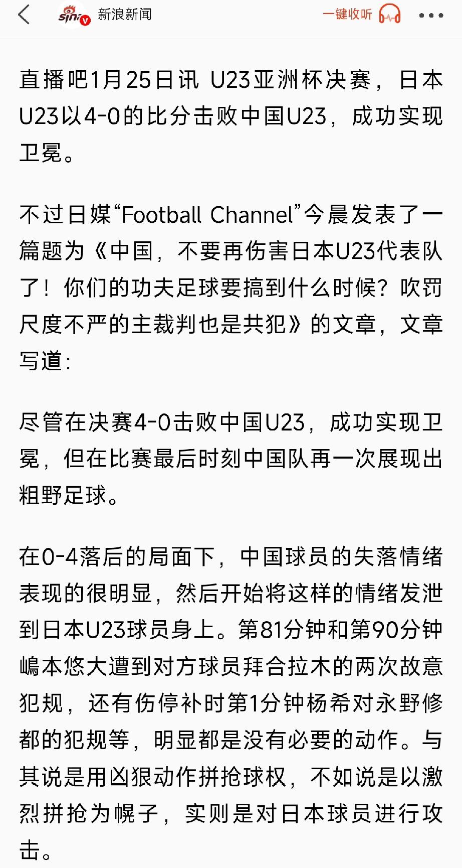 日媒一篇“功夫足球”文章,把U23亚洲杯亚军的喜悦全冲没了。 他们盯着最后十几分钟那几个犯规动作,硬扣上“攻击对手”的帽子。说实话,看录像时我也皱眉——大比分落后心态失衡,动作确实欠妥。可“功夫足球”这标签一贴,味道就变了。 有意思的是,日本网友自己都在吵。有人骂裁判太松,也有人说决赛出牌要慎重。但最刺眼的,是那句“那些觉得能赢日本的中国球迷在哪”。 这哪是在说犯规?这是在说中国足球的“人设”。 二十年了,我们总在重复同样的剧本。2004年那个手球进球,日本人说是“运气球”;2018年打伊朗,裁判的哨子偏到离谱。现在U23好不容易进决赛,结果焦点全被拉到“作风问题”上。 输了球,连呼吸都是错的。 但咱们自己也别光委屈。那几个犯规确实不该,大比分落后更该守住体育精神。中国足球这些年,技术进步慢,脾气倒见长。场上急眼,场下骂街,这风气不治,永远别想赢得真正尊重。 日媒文章是不厚道,可人家赢了球,就有话语权。竞技体育就这么现实——用实力说话,比用键盘反驳管用一万倍。 现在该做的不是对骂,是回家看看录像,想想下次遇到日本队,怎么用脚把面子踢回来。毕竟,被说“功夫足球”不可怕,可怕的是除了“功夫”,我们拿不出别的东西。