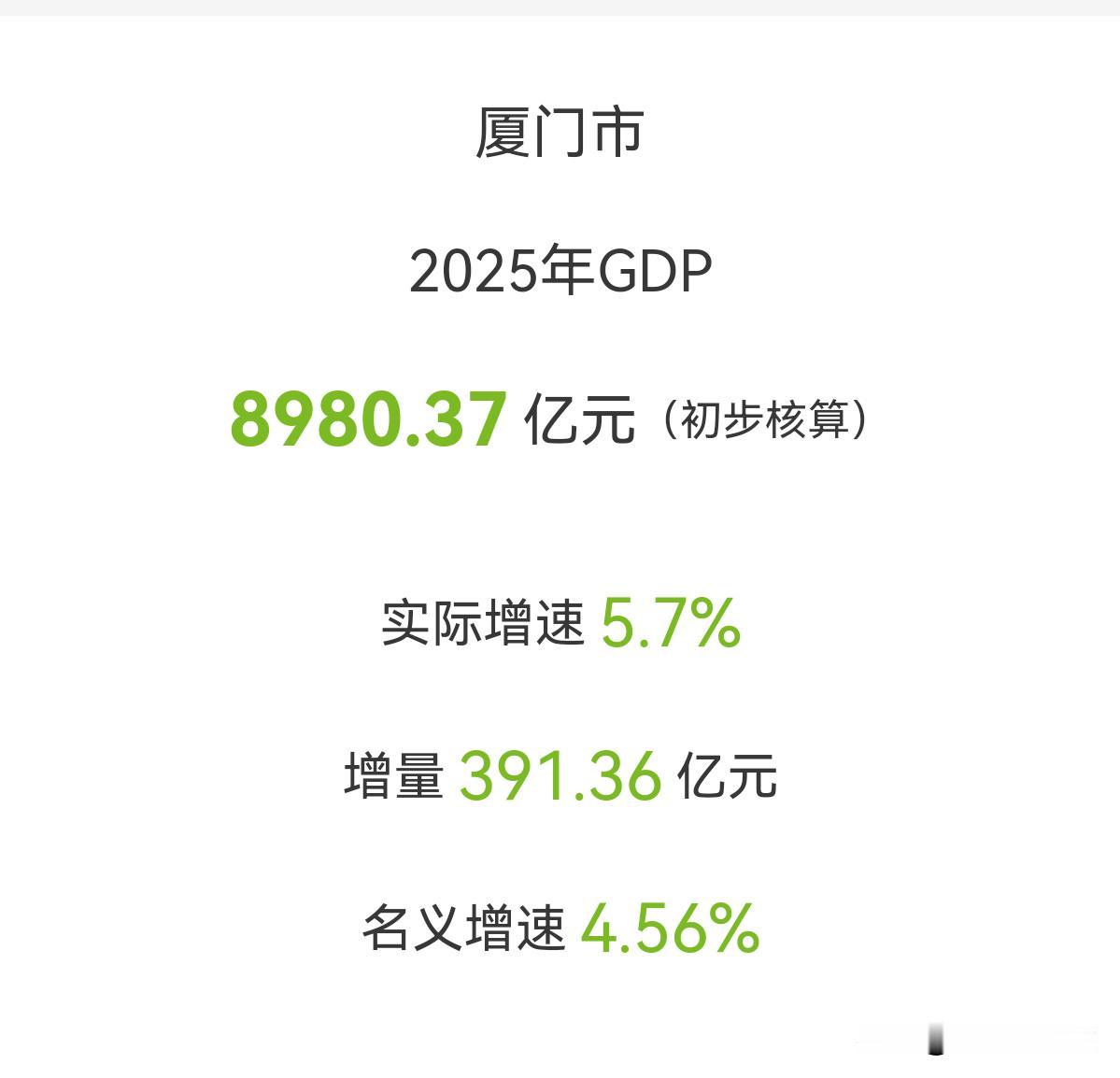 厦门市2025年GDP8980.37亿元,同比增长5.7%,离9000亿元大关一步之遥。 这个增速,也高于全国和全省0.7个百分点,在副省级城市中也位居前列。