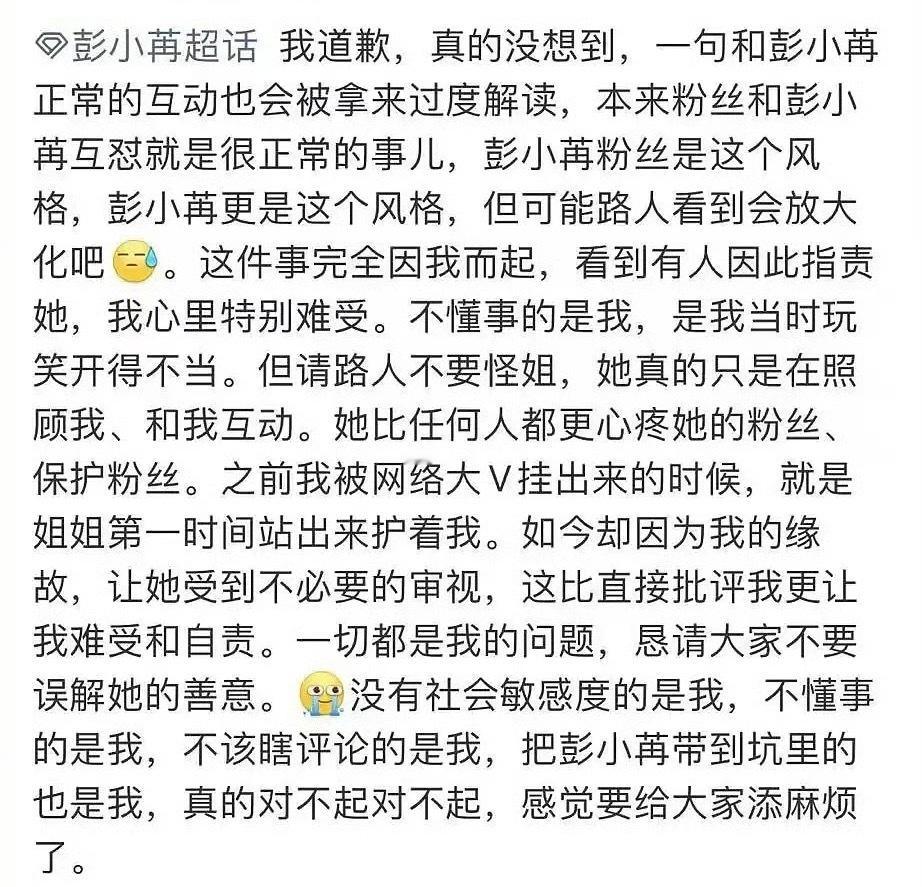 彭小苒祝粉丝天天加班,随后粉丝发文道歉