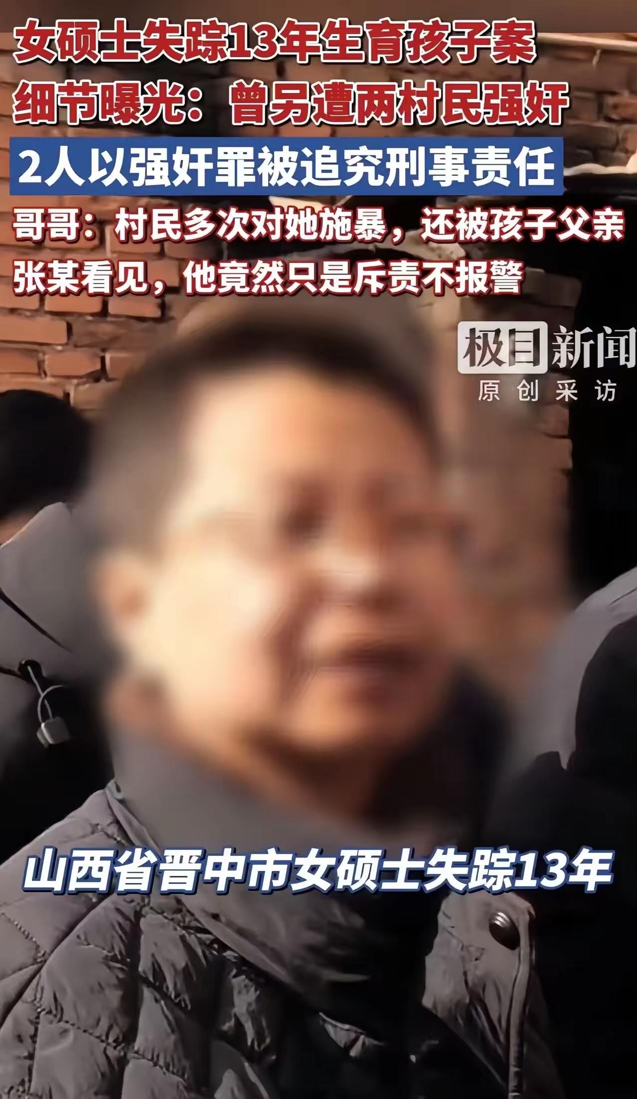 这起“女硕士失踪13年,生育孩子案”暴露出农村地区在法律执行、社会保护以及公共意识方面的严重缺失,也反映出深层的社会结构与文化问题。以下是对事件的分析和思考: 一、案件背景与事实揭露 女硕士卜某因精神疾病离家,流落偏远村庄后被张某收留,但很可能涉嫌非法拘禁和性剥削长达13年。 在这期间,卜某多次遭受村民张某国、张某林的强奸,甚至在孩子的父亲——张某的目睹下发生。 卜某最终被找到时已精神失常,育有数名子女。这不仅是个人悲剧,也是农村社会保护机制的失败。 二、法律与司法问题 检方对张某作出不起诉决定,但对其他村民提起公诉,反映出在办案过程中存在选择性执法或证据不足的问题。 张某虽未承担法律责任,但他的行为和对卜某的纵容、邻居的冷漠,彰显制度执行的薄弱和责任缺位。 三、社会与文化因素 村民和基层组织的沉默与纵容,凸显封闭、落后的乡村文化,对于妇女、精神障碍者的权益保障严重不足。 公众媒体的曝光引发广泛关注,也反映出社会对农村女性尤其是边缘人群的关切不足,缺乏应有的保护和救助机制。 四、高等教育女性在农村环境的悲剧意义 卜某作为高学历女性,却在农村“无主无助”,说明教育和法律保护不能完全保证个人安全。 这也警示社会应加强对边缘群体,特别是精神障碍者的保护力度,完善法律制度和救援体系。 五、制度层面的反思 事件暴露了基层治理的漏洞:没有有效的监控、举报和保护渠道。 法律执行存在难点:涉及多方责任追究不到位,司法偏差或程序上的不公。 社会应建立更完善的公共安全、心理健康、法律援助等机制,确保每个弱势群体都能得到应有的保护。 六、公众情感与社会责任 网友的愤怒是对制度失职、社会冷漠的表达,也是对受害者的声援。 需社会各界共同反思:如何在最边缘的角落,让正义不再缺席?如何让受害者不再沉默?如何构建尊重与保护每个人权益的社会环境? 总结: 这起案件不是孤立事件,它折射出我国农村地区在法治、伦理、文化等方面的深层次问题。我们需要从制度创新、法律落实、公众教育等多维度共同努力,确保类似悲剧不再重演,让每一个生命都能被尊重和保护。失踪事件 全国人口失踪案 `