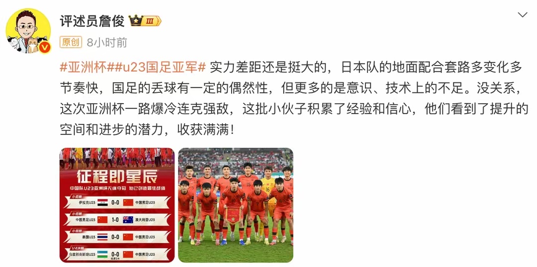 黄健翔评U23国足亚洲杯决赛:4个丢球里两个折射一个点球,运气守恒国足U23亚洲杯亚军中国男足 1月25日凌晨,U23国足亚洲杯决赛0:4不敌日本队获得亚军后,著名评论员黄健翔和詹俊先后发表了对比赛的看法。两位名嘴既肯定了球队的拼搏精神,也冷静指出了中国足球与亚洲顶尖水平的差距。黄健翔发博谈到,0比4的比分确实太残酷了。两个折射一个点球,运气守恒了,神仙也没办法。但是必须承认与正视和对手的整体实力差距,因为这是中国足球接下来努力的起点。亚军,是这支球队拼出来的,可以说是当前自身实力水平下的超极限成绩。并不是代表我们就有了这个年龄段亚洲前两名的实力排名。杯赛的特性给了我们黑马逆袭的机会,我们的队伍抓住了。感谢教练员们和队员们,在中国足球最低谷的时候,用这个亚军,带来的鼓舞。当他们归来的时候,应该得到掌声和鲜花,还有同胞们温暖的目光。因为我相信,这会激励他们今后继续努力,为中国足球奋斗。詹俊则从技战术层面分析了比赛:实力差距还是挺大的,日本队的地面配合套路多变化多节奏快,国足的丢球有一定的偶然性,但更多的是意识、技术上的不足。没关系,这次亚洲杯一路爆冷连克强敌,这批小伙子积累了经验和信心,他们看到了提升的空间和进步的潜力,收获满满!